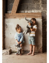 Bio-Baumwoll-Plüsch (kbA) macht ihn weich und anschmiegsam. Durch die Öffnung am Bauch gelangt man an das herausnehmbare Baumwollkissen, das bei den großen Kuscheltieren