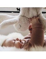 Bio-Baumwoll-Plüsch (kbA) macht ihn weich und anschmiegsam. Durch die Öffnung am Bauch gelangt man an das herausnehmbare Baumwollkissen, das bei den großen Kuscheltieren