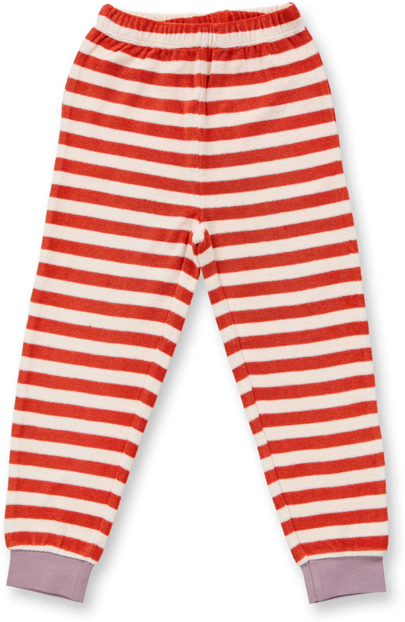 Das schöne rot-creme Streifen-Design wird durch lila farbende Bündchen ergänzt, die den Look stilvoll abrunden 🤍