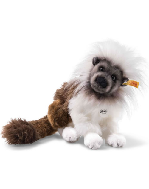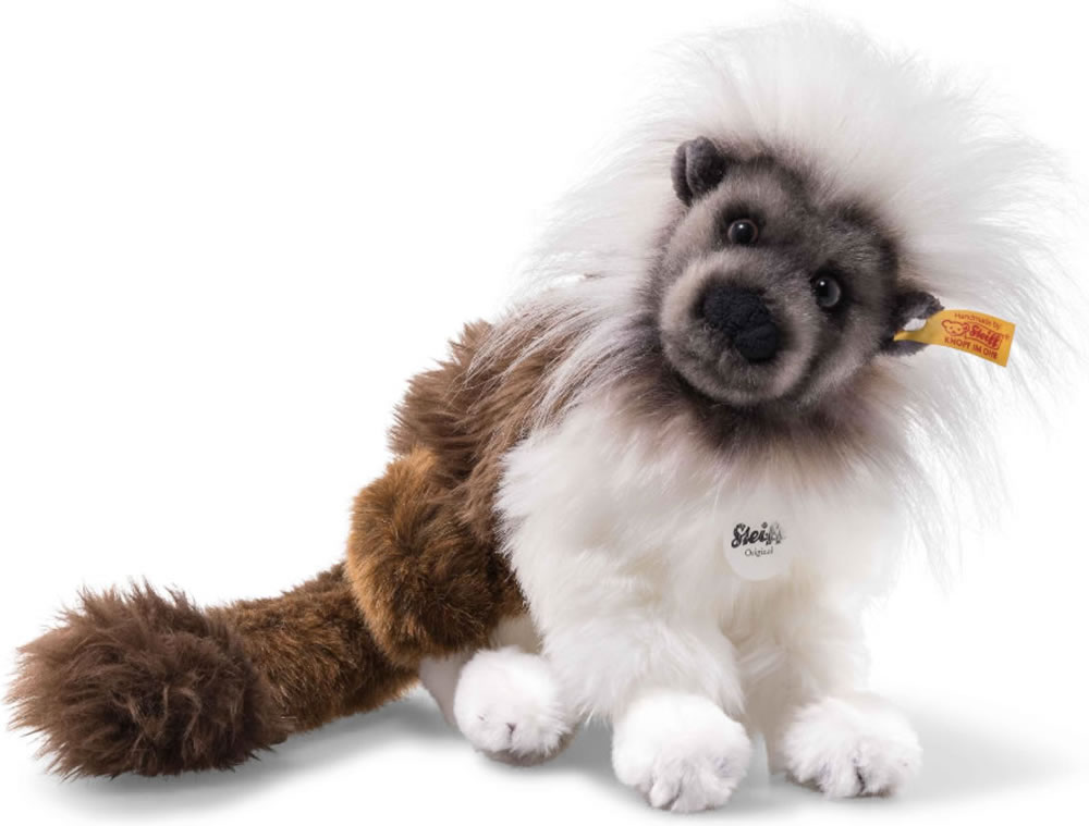 Ein putziger Geselle ist der 23 cm große Protect Me Tami Affe. Sein lebendiges Vorbild stammt aus der Familie der Krallenaffen und ist durch die Vernichtung seines Lebensraumes in Form von Abholzung des Regenwaldes extrem stark gefährdet. Wegen seines niedlichen Aussehens wird dieses Äffchen auch gefangen und als Haustier gehalten. Es steht auf der roten Liste der bedrohten Tierarten und ist vom Aussterben bedroht. Hier aber ist es aus kuschelweichem Plüsch. Das Gesichtchen ist grau und der Kopf von langem, weißem Plüsch umgeben. Die Airbrush-Technik in Braun hebt die Krallen, den Ohrenrand, das Mäulchen und die Gesichtsmaske hübsch hervor. Der Bauch ist weiß und geht in das braune Hinterteil mit dem langen, buschigen Schwänzchen über. Die Stabwickler in den Vorderbeinen sorgen für einen guten Halt beim Sitzen. Mit diesem niedlichen, liebevoll gestalteten Kameraden wird Ihr Kind an die wunderhübsche Tierwelt erinnert und es hat einen exotisch aussehenden Spielkameraden.