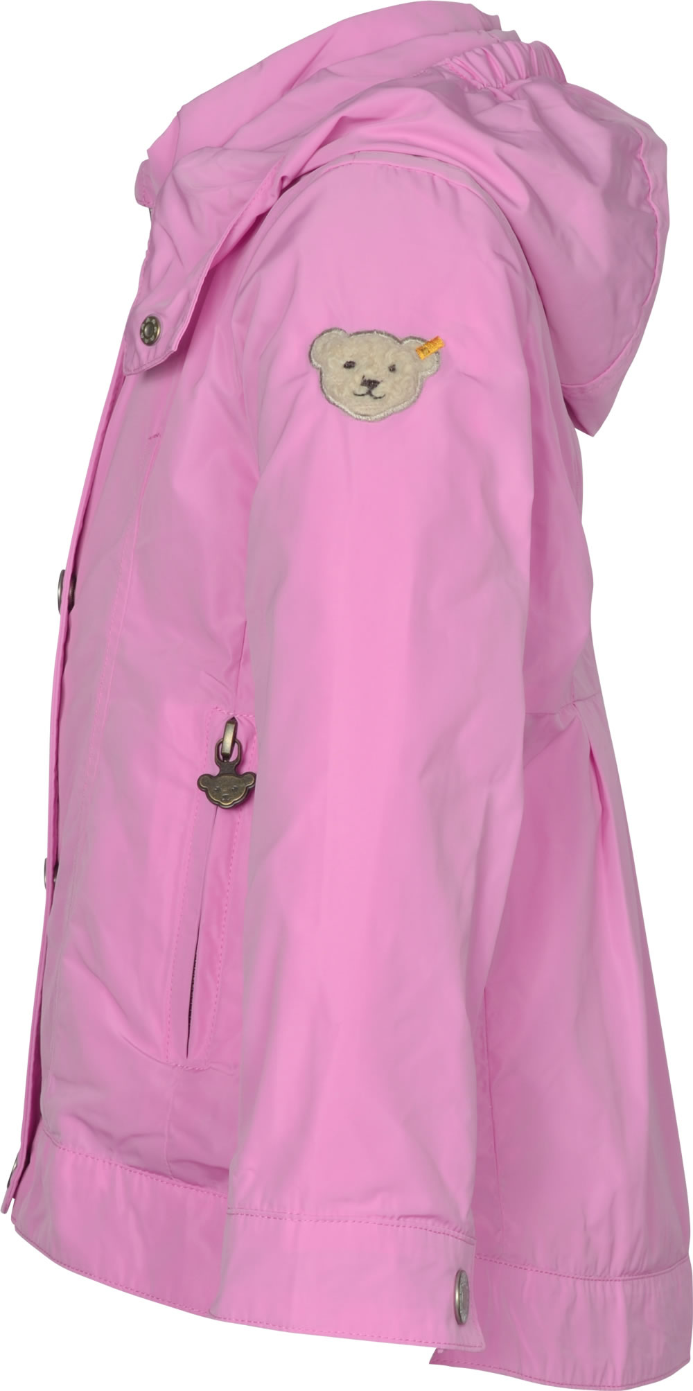 Leichte Sommer-Jacke in rosa mit abzippbarer Kapuze aus der Confetti-Kollektion von STEIFF für Mädchen. Die Jackeninnenseite ist mit einem weichem Baumwoll-Futter ausgestattet. Am Reißverschluss, der durch eine Knopfleisten-Lasche verdeckt wird, befindet sich der kleine STEIFF Bär als Zipper-Anhänger. Der kleine STEIFF Teddy ziert den linken Oberarm. Die hübsche Jacke ist in A-Linie geschnitten und mit ihrer tollen Optik ein schöner Begleiter für die warme Jahreszeit.