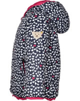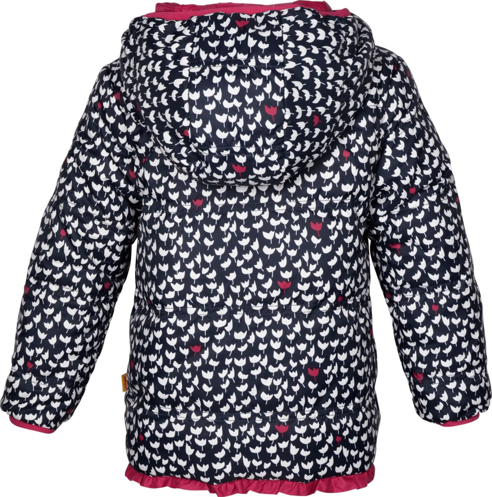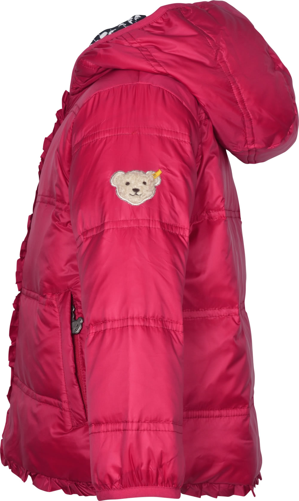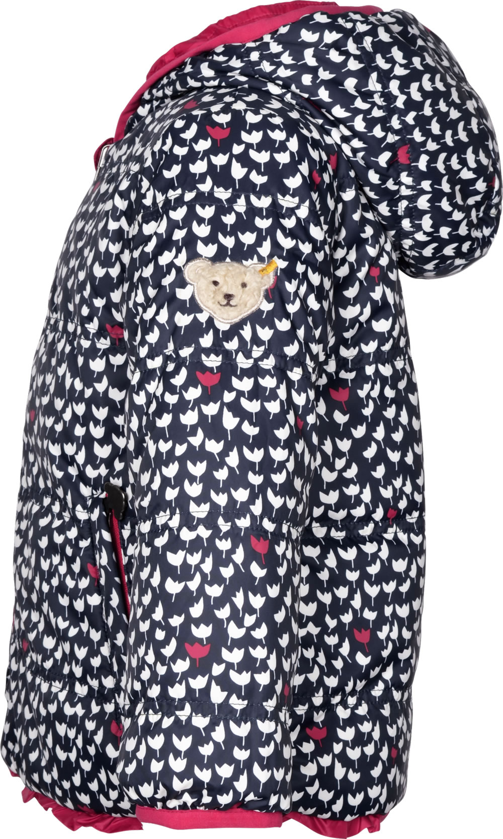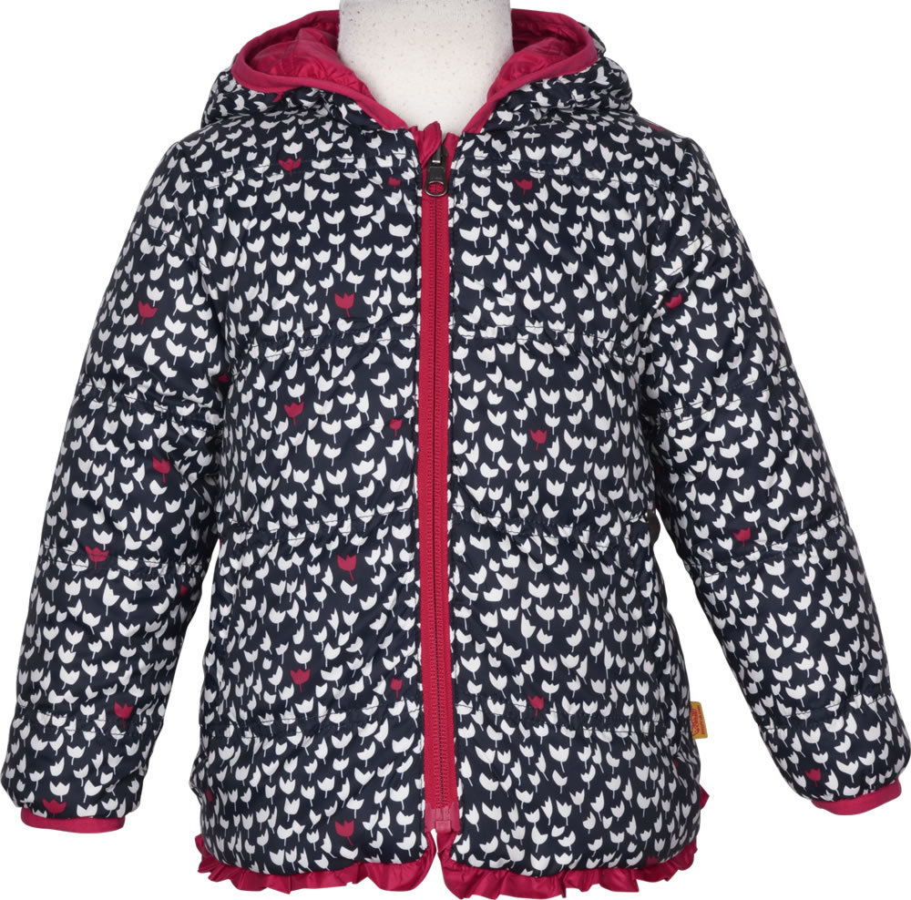 Hübsche Frühlings-Jacke mit Kapuze zum Wenden für Mädchen in rot von STEIFF aus der aktuellen Hello Spring-Kollektion. Gewendet ist die Jacke mit einem verspielten Tulpen-Muster in blau und weiß zu tragen. Sie ist in A-Linie geschnitten und mit ihren schönen Details, wie Paspeln an Reißverschluss und Saum sowie den kleinen Reißverschluss-Anhängern in Bärchenkopf-Form, ein toller Blickfang. Der Bärenkopf, das Steiff-Markenzeichen, ziert den linken Oberarm. Auf jeder Seite bieten zwei Taschen Platz für Kleinigkeiten. Durch ihr leichtes Material die mädchenhafte Jacke angenehm zu tragen.