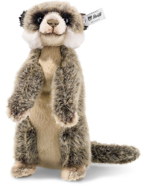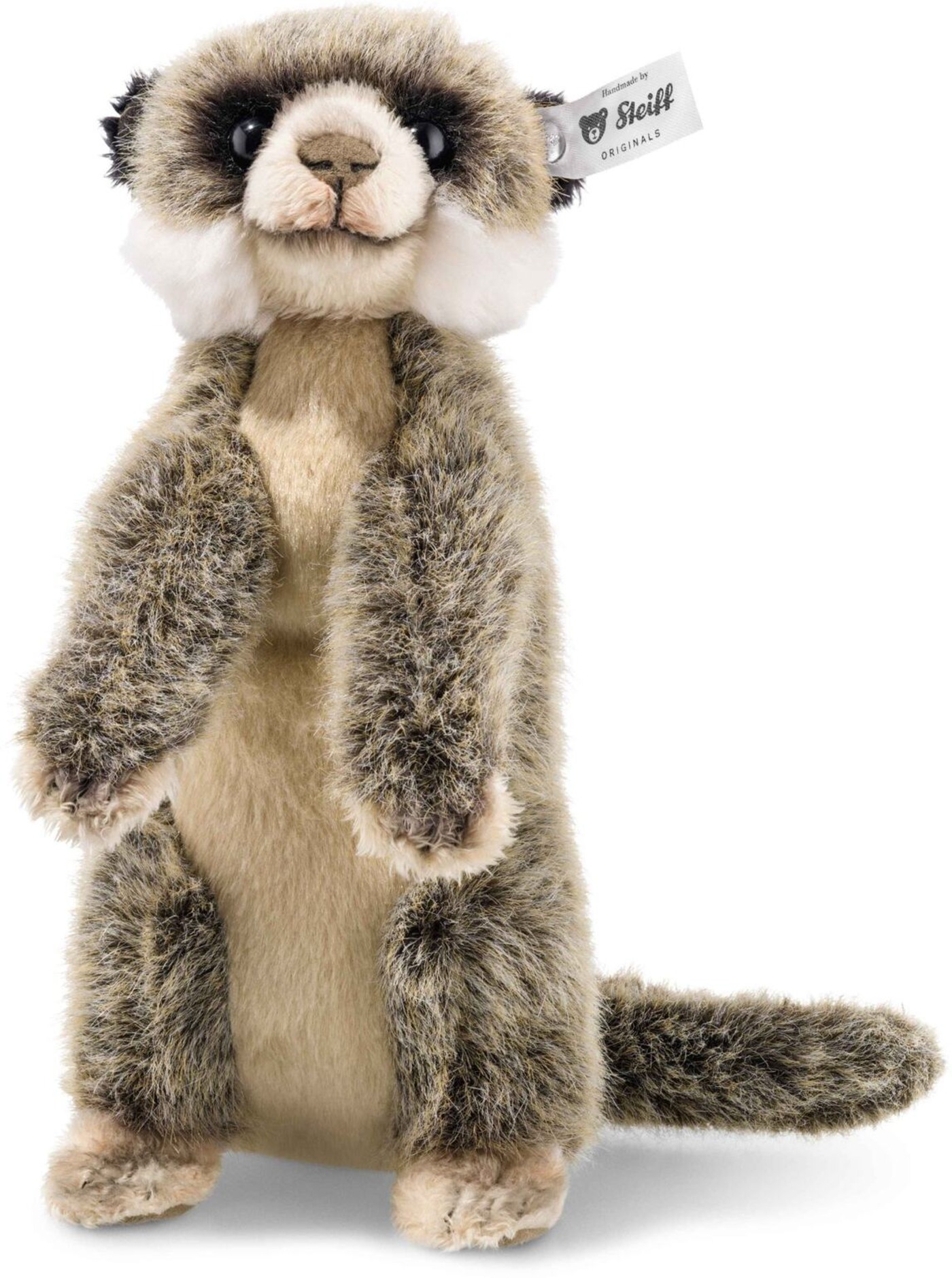 Wer schaut denn hier mit vorwitzigem Gesichtchen in die Welt? Es ist das 22 cm große Erdmännchen Baby, das unternehmungslustig auf einen Spielkameraden wartet. 🥰
