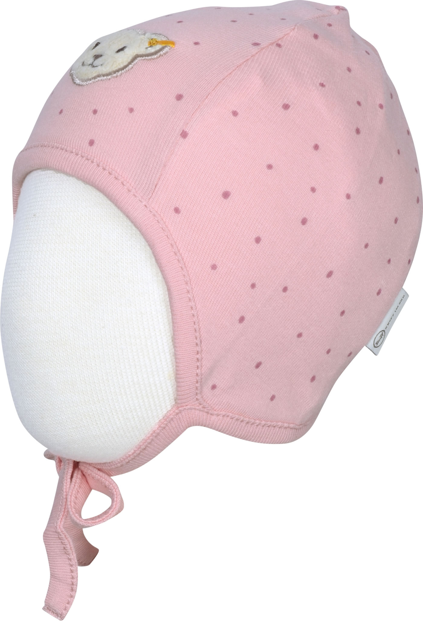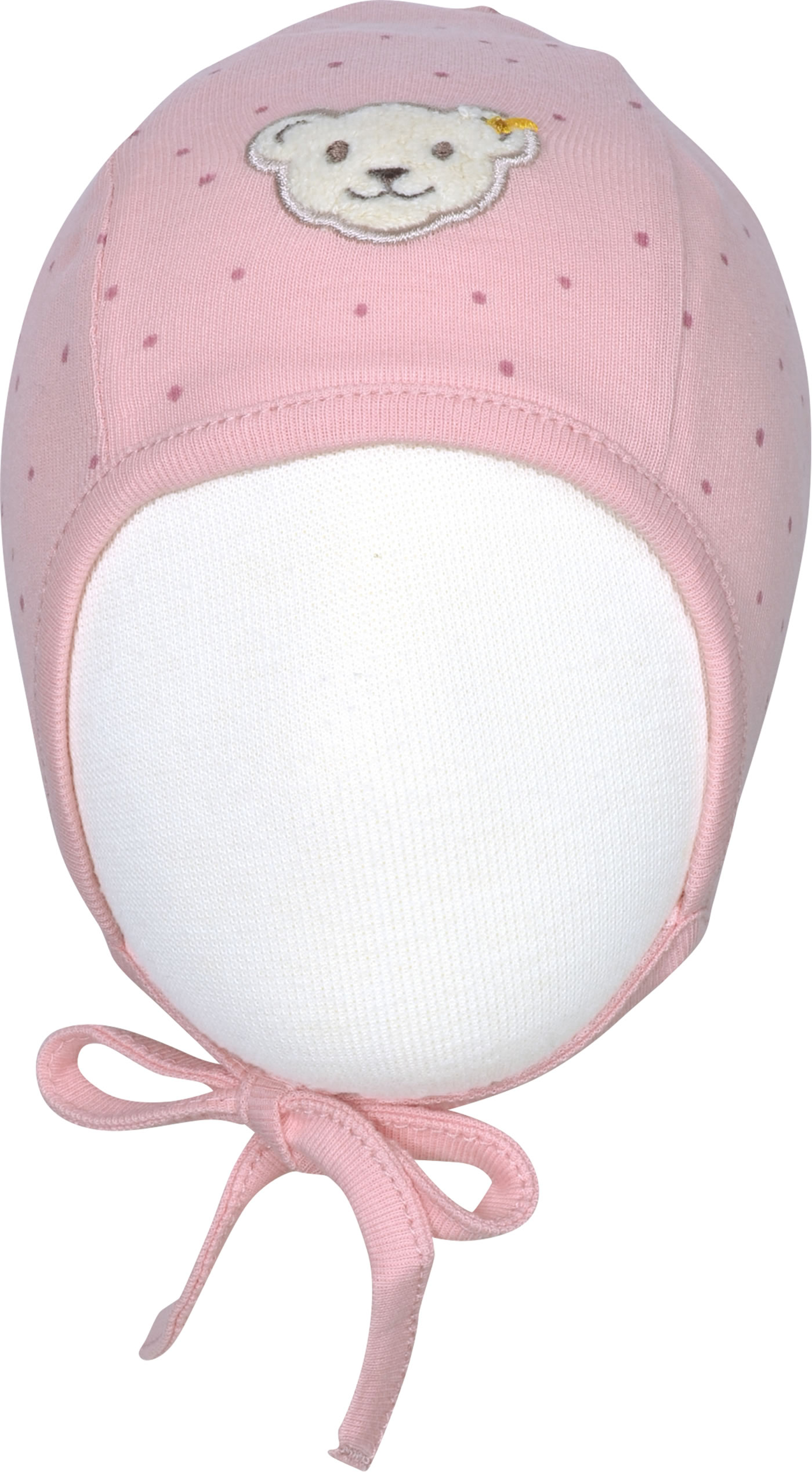 Doppellagige Jerseymütze von STEIFF aus der Baby Organic Just Dots-Kollektion. Die Vorderseite ziert der kleine STEIFF Bär. Das Bindeband sorgt für einen guten Halt.