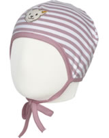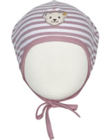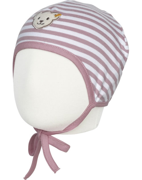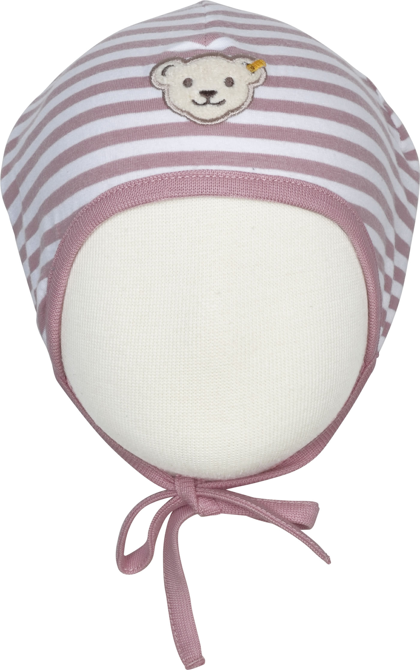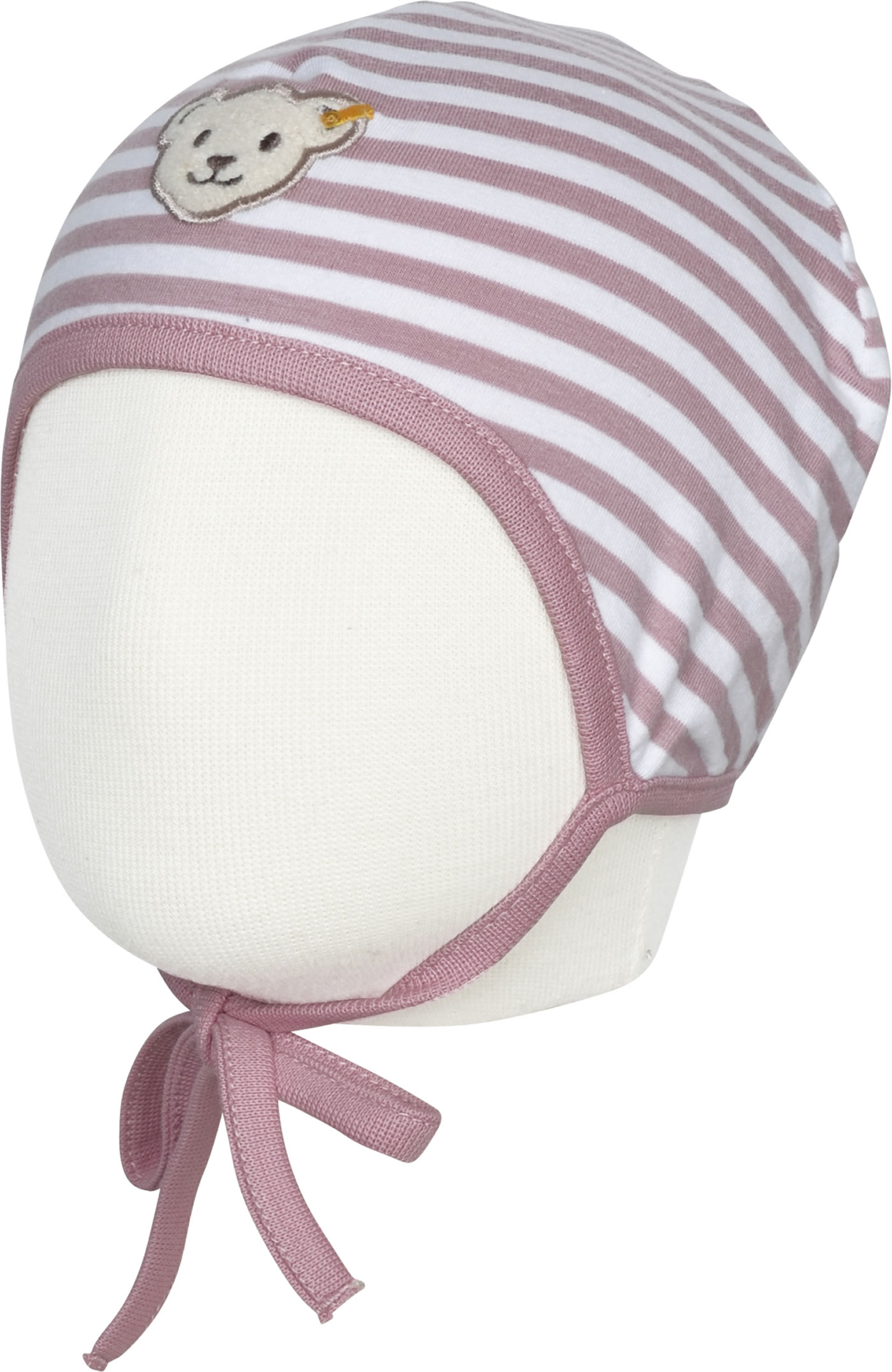 Gestreifte Jerseymütze von STEIFF aus der Raindrops Baby Organic-Kollektion für Mädchen. Die Vorderseite ziert der kleine STEIFF Bär. Das Bindeband sorgt für einen guten Halt.
