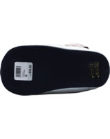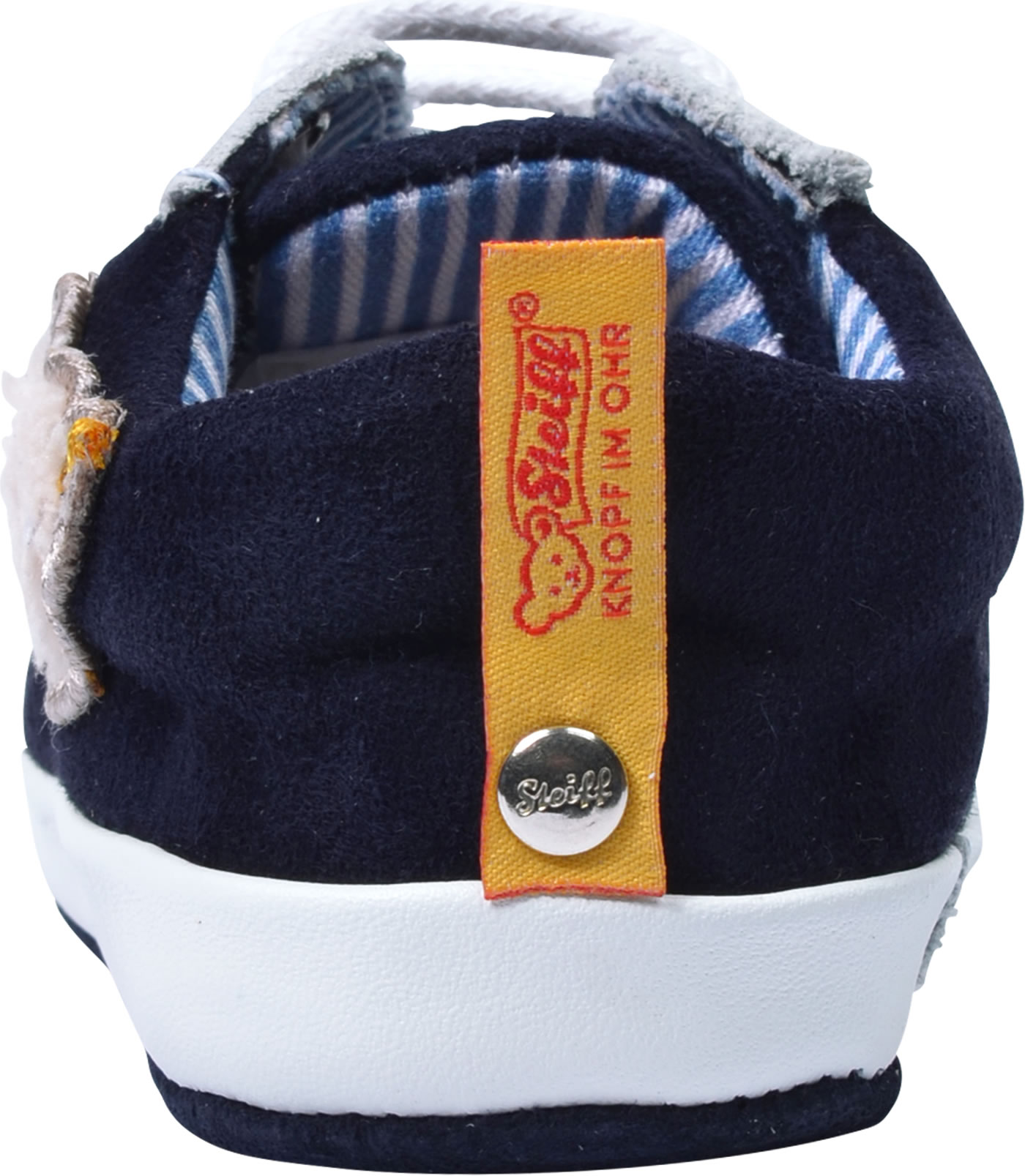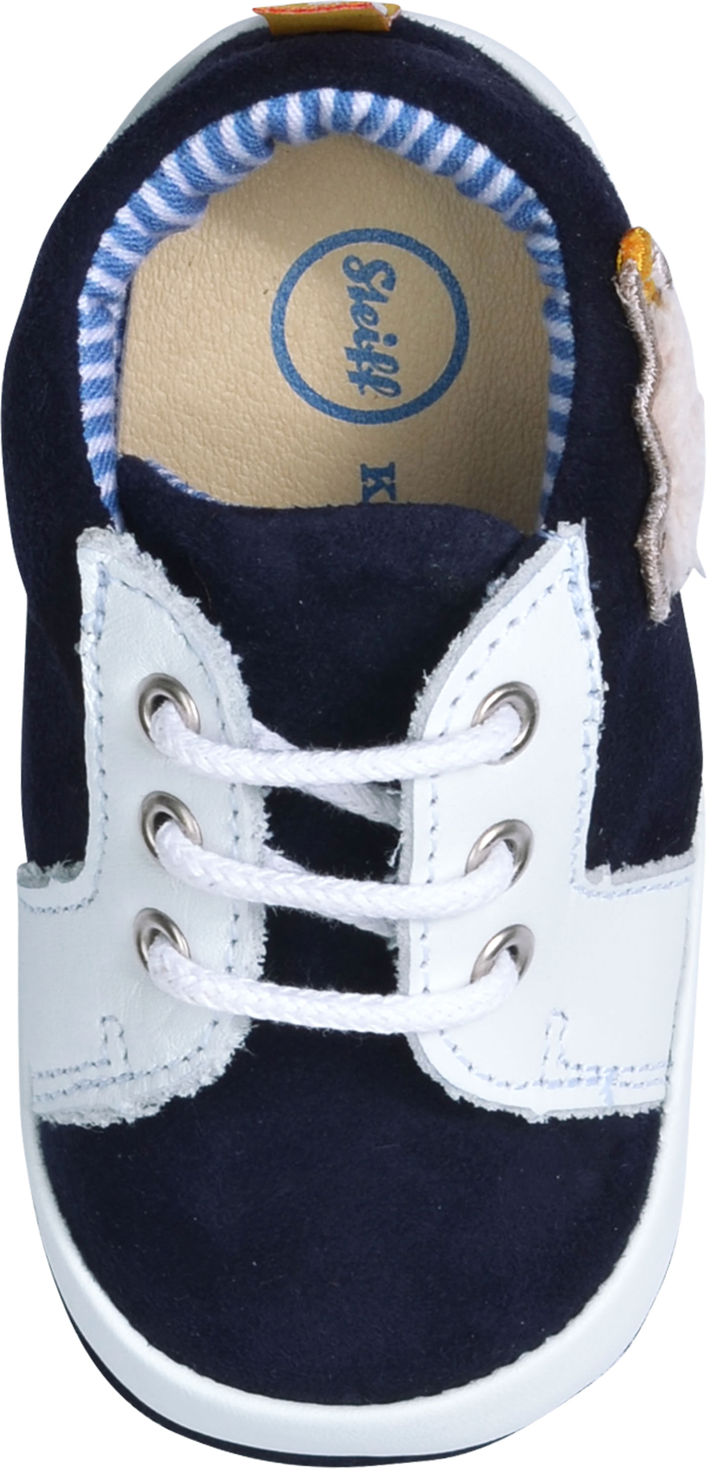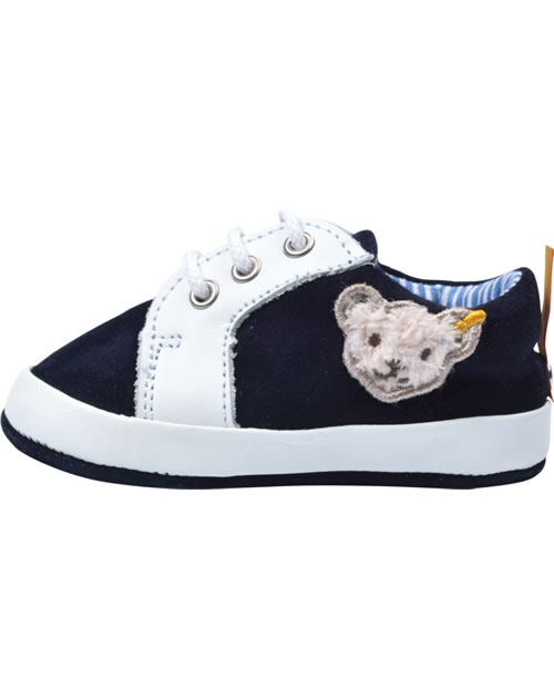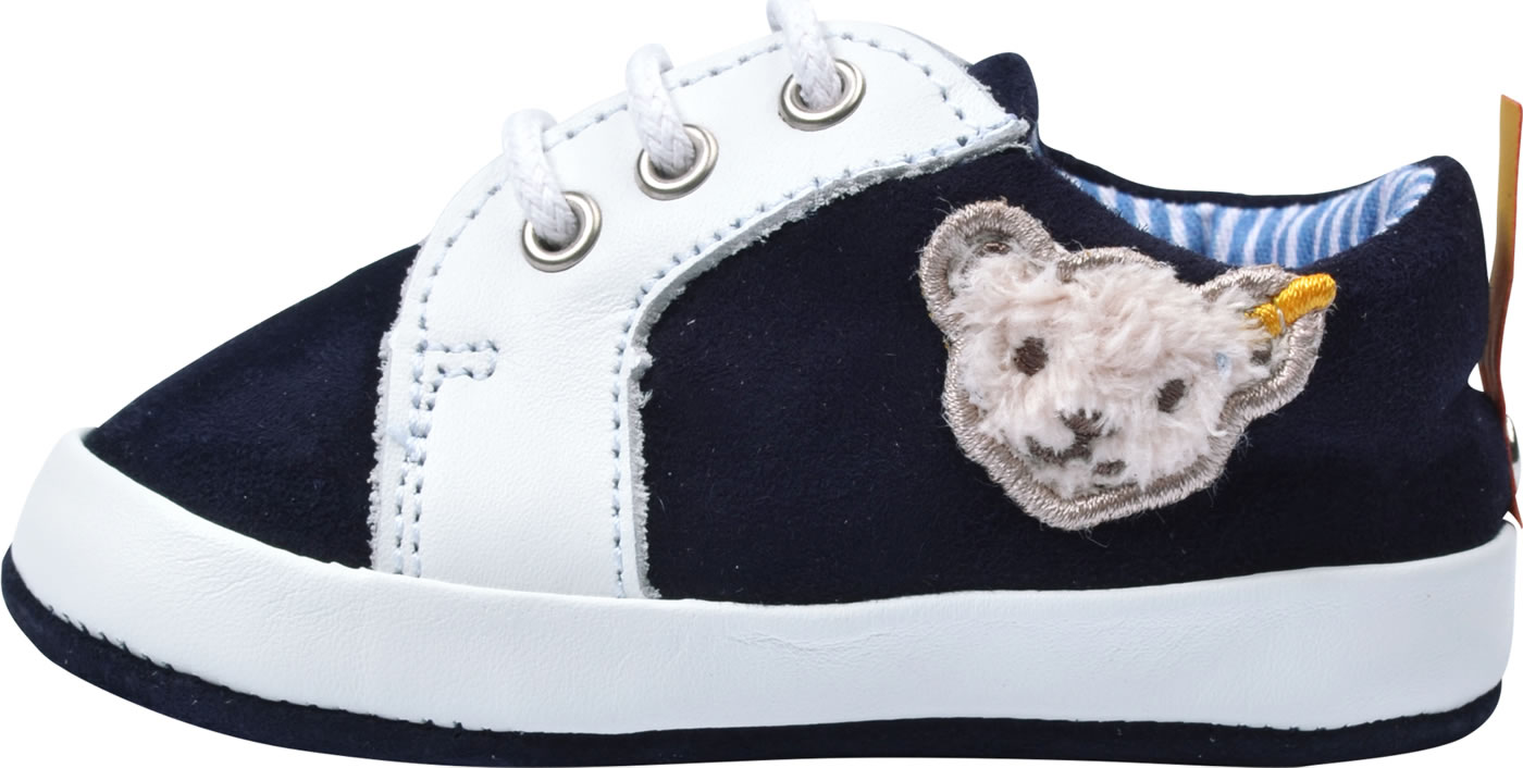 Hochwertige Baby-Schuhe aus Glatt- und Veloursleder. Die knöchelhohen Schuhe haben eine klassische Schnürung, so dass der Schuh optimal an Babys Fuß angepasst werden kann. Der Schuh ist innen mit gestreiftem Stoff und die Innensohle aus Leder ist herausnehmbar. Der aufgestickte STEIFF Bär ziert die Außenseite.