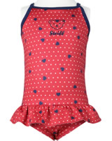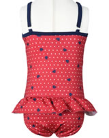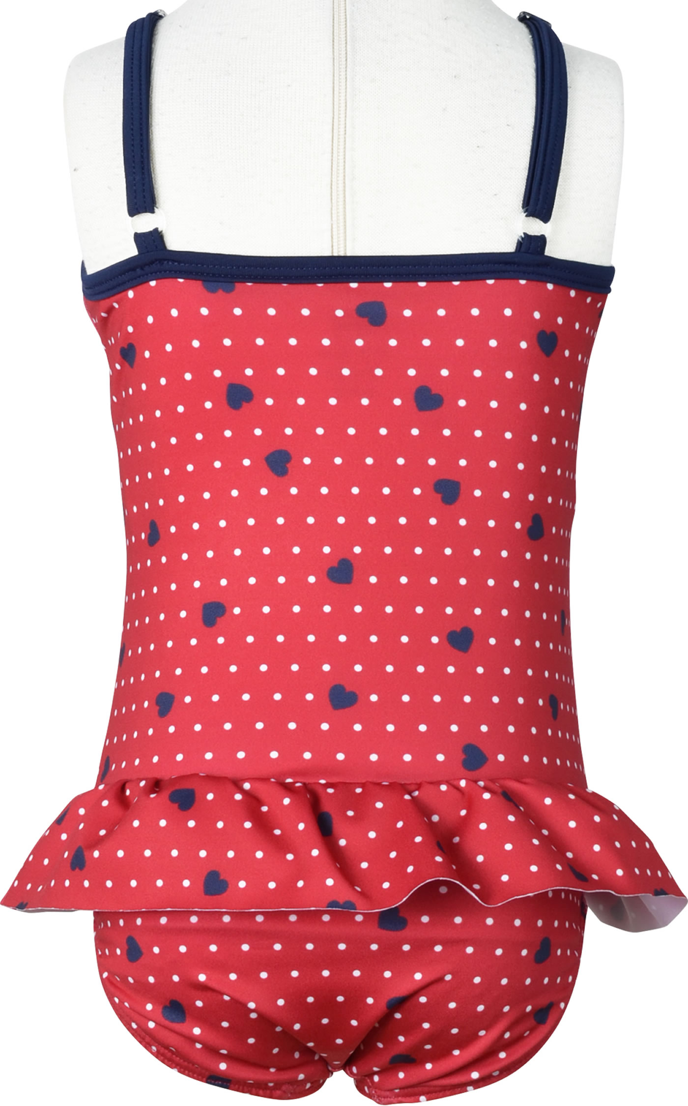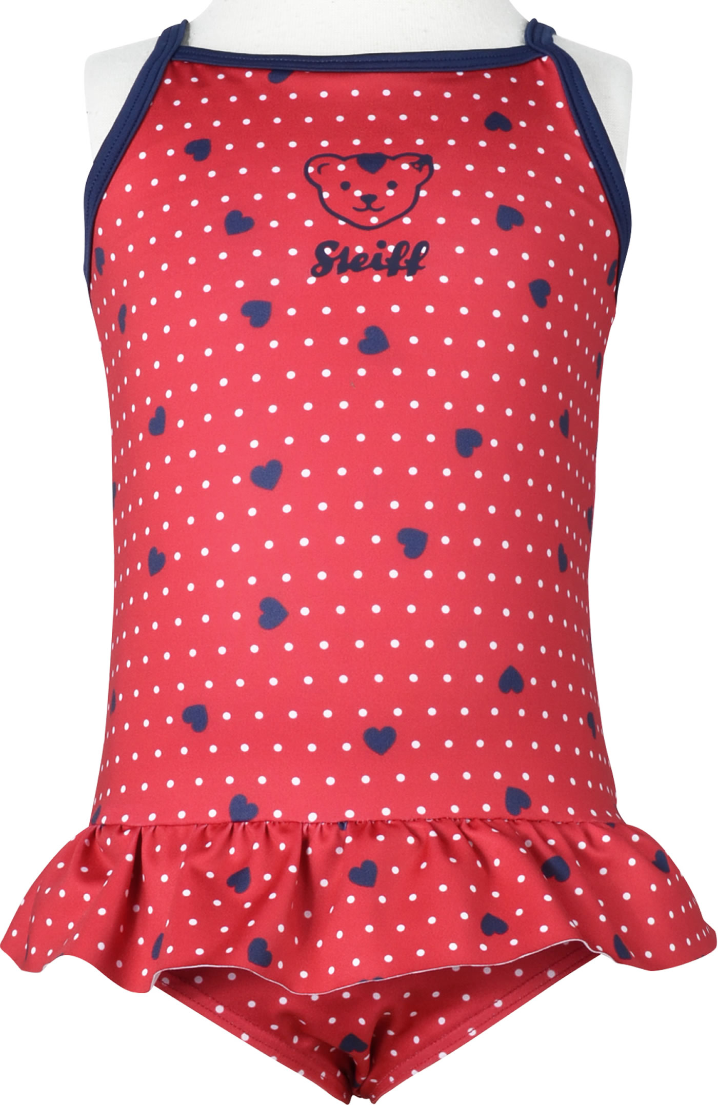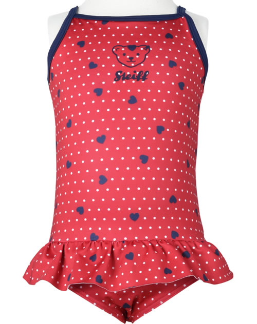 Hübscher Badeanzug von STEIFF in rot mit Schößchen. Ein toller Hingucker sind die Herzen und Punkte und der STEIFF Bären-Duck auf der Brust. Die Träger lassen sich in der Länge verstellen.
