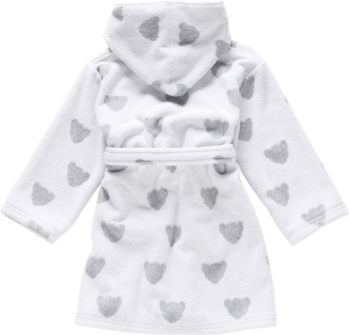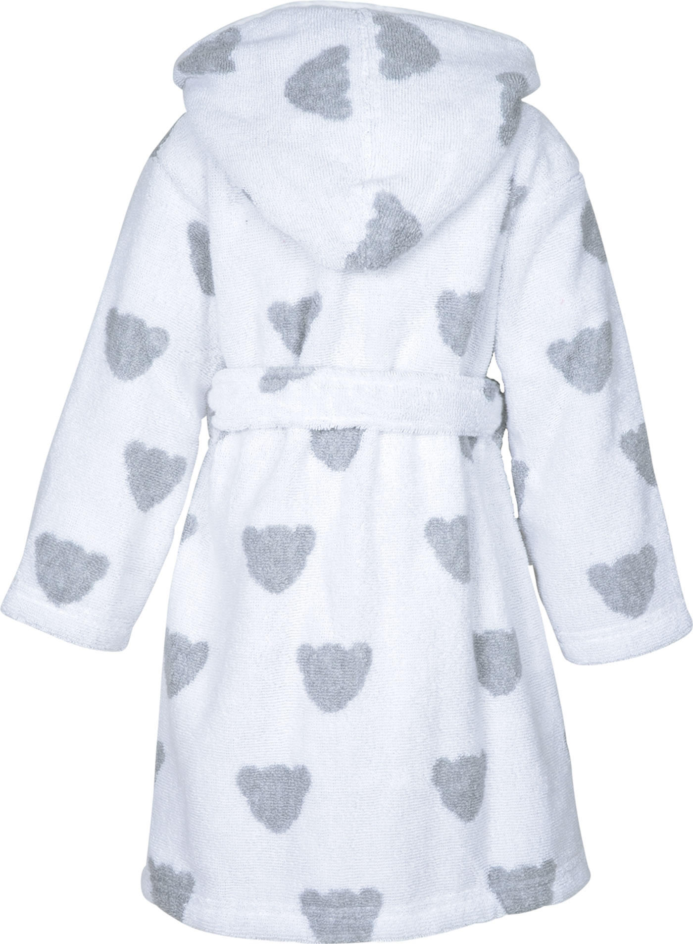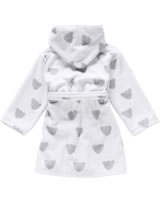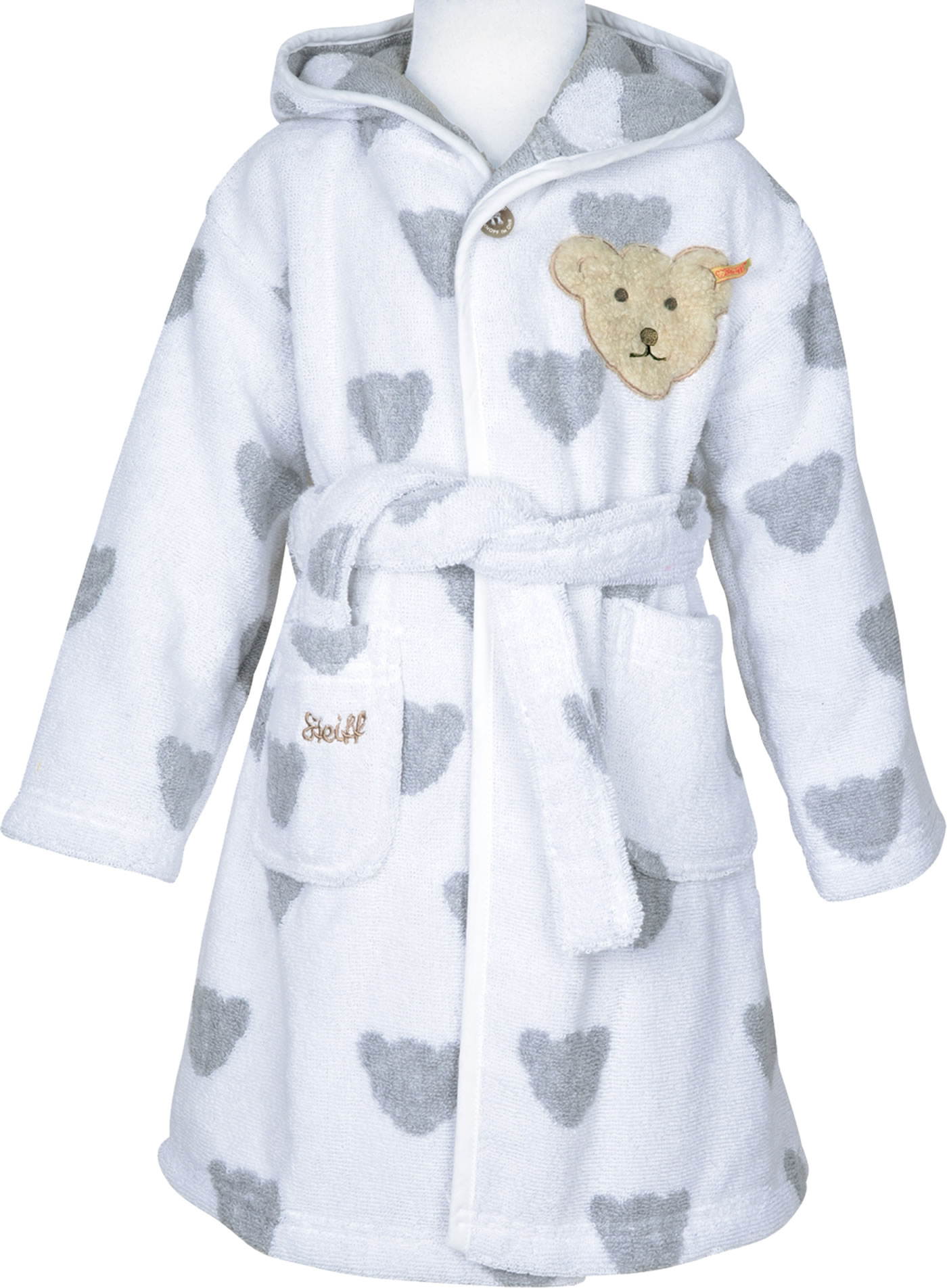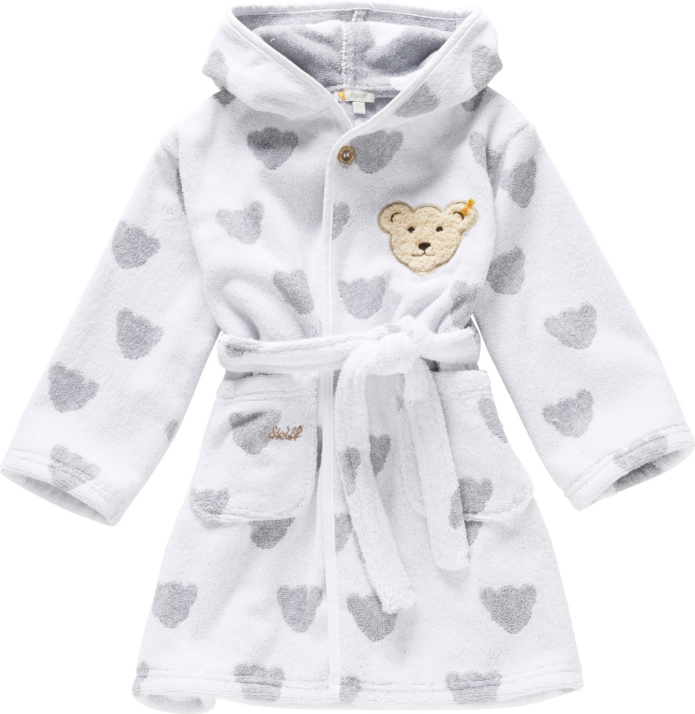 Hübscher Bademantel von STEIFF mit niedlichen Bären-Applikation auf der linken Brust. Das hübsche Bärenkopf-Muster in zartem Grau ist ein toller Hingucker. Der Bademantel hat 2 Eingrifftaschen, in denen schnell kleine Schätze verstaut werden können. Für das wohlig kuschlige Gefühl sorgt die weiche Kapuze. Mit dem Bindegürtel kann der Bademantel geschlossen werden.