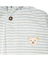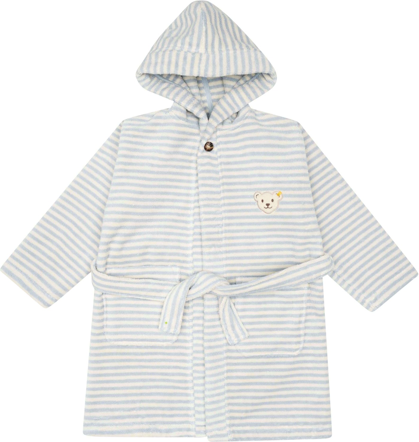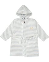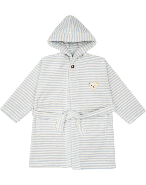 Gestreifter Bademantel mit Kapuze von STEIFF aus der Home Textiles Kollektion. Geschlossen wird der Bademantel mit einem Knopf am Hals und einem Bindegürtel. Ob nach einem Bad in der Wanne oder nach dem Schwimmen - der weiche Frotteestoff spendet sofort kuschelige Wärme und nimmt Nässe schnell auf. Zwei Taschen bieten Platz für kleine Schätze und der STEIFF Bär ziert die Brust.