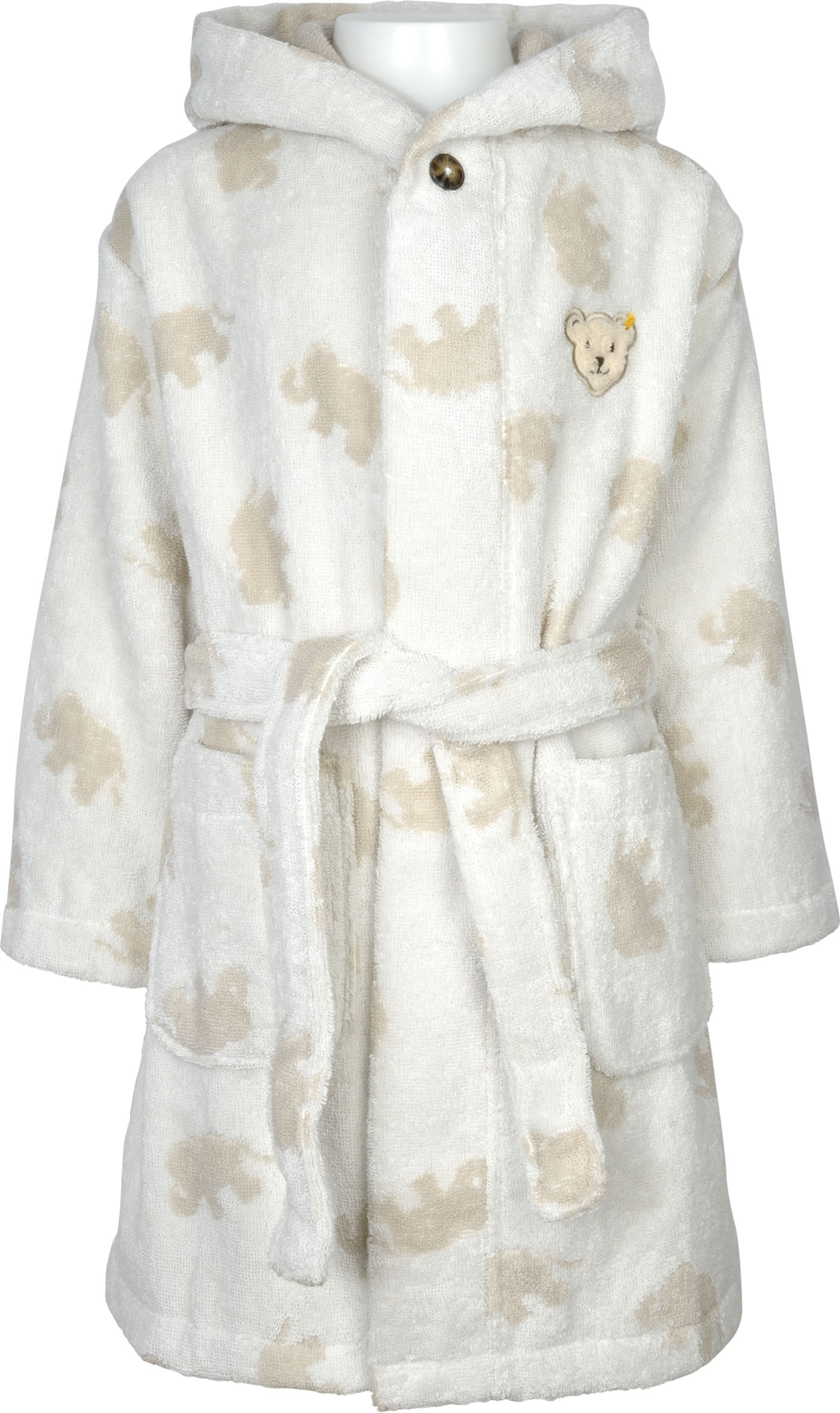 Bademantel mit Kapuze von STEIFF aus der Home Textiles Kollektion. Geschlossen wird der Bademantel mit einem Knopf am Hals und einem Bindegürtel. Ob nach einem Bad in der Wanne oder nach dem Schwimmen - der weiche Frotteestoff spendet sofort kuschelige Wärme und nimmt Nässe schnell auf. Zwei Taschen bieten Platz für kleine Schätze und der STEIFF Bär ziert die Brust. Ein besonders schönes Detail sind die kleinen Elefanten, die sich auf dem Bademantel tummeln und an das STEIFF Elefäntle erinnern.