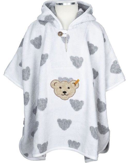 Der Badeponcho von STEIFF mit dem hübschen Bärenkopf-Muster ist ein toller Hingucker. Auf der Vorderseite befindet sich die STEIFF Plüsch-Bären-Applikation und auch eine Kapuze ist vorhanden.