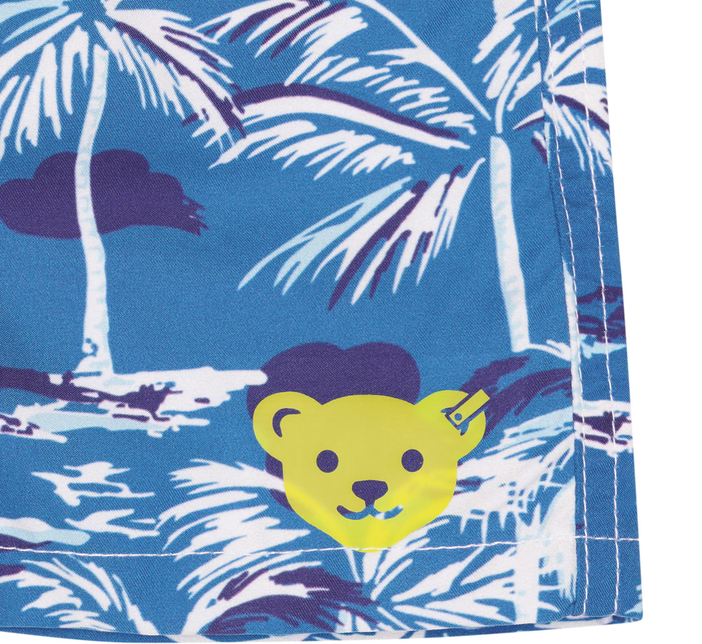 Coole Schwimm-Shorts mit Palmenmotiv von STEIFF für Jungen. Der STEIFF Bär ziert die Vorderseite. Von innen sorgt ein eingenähter Slip für ein komfortables Tragegefühl. Zwei Einstecktaschen und eine hintere Tasche bieten Platz für kleine Schätze. Das Material bietet Sonnenschutz mit UPF 50+.
