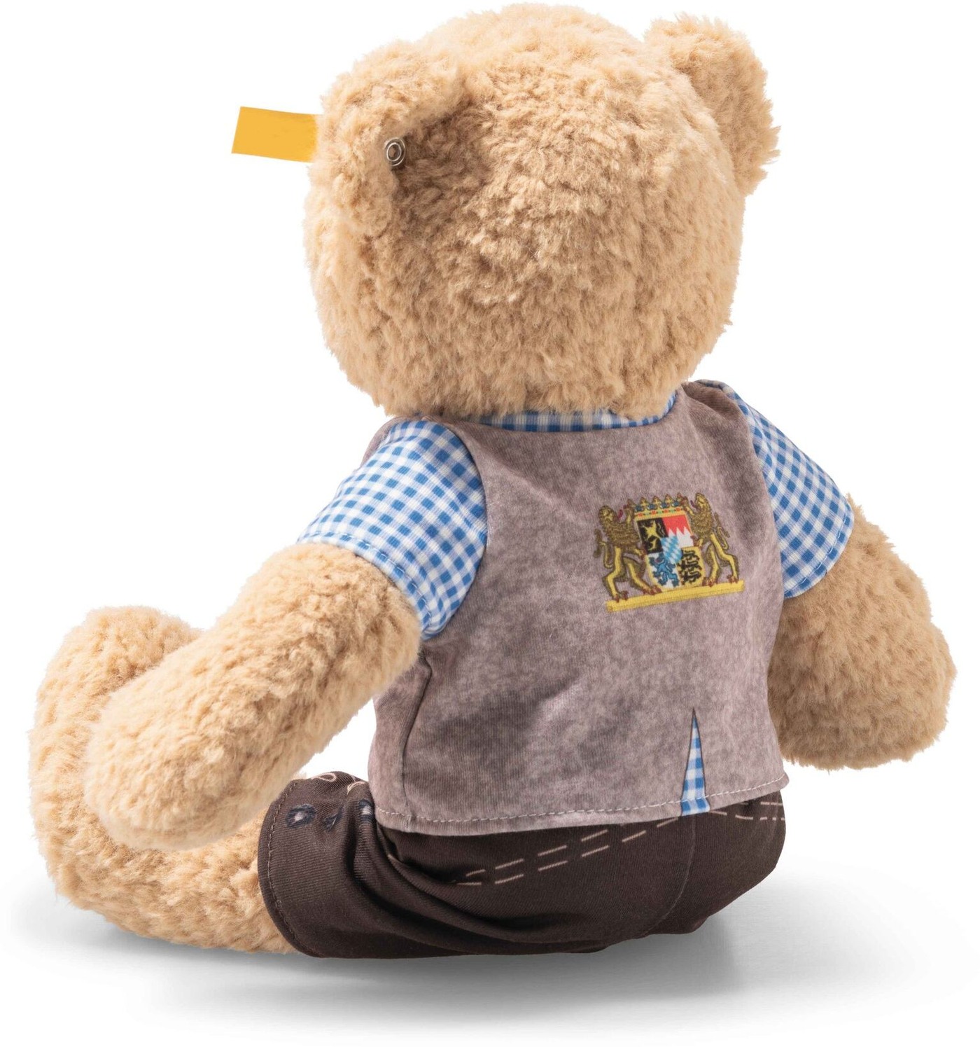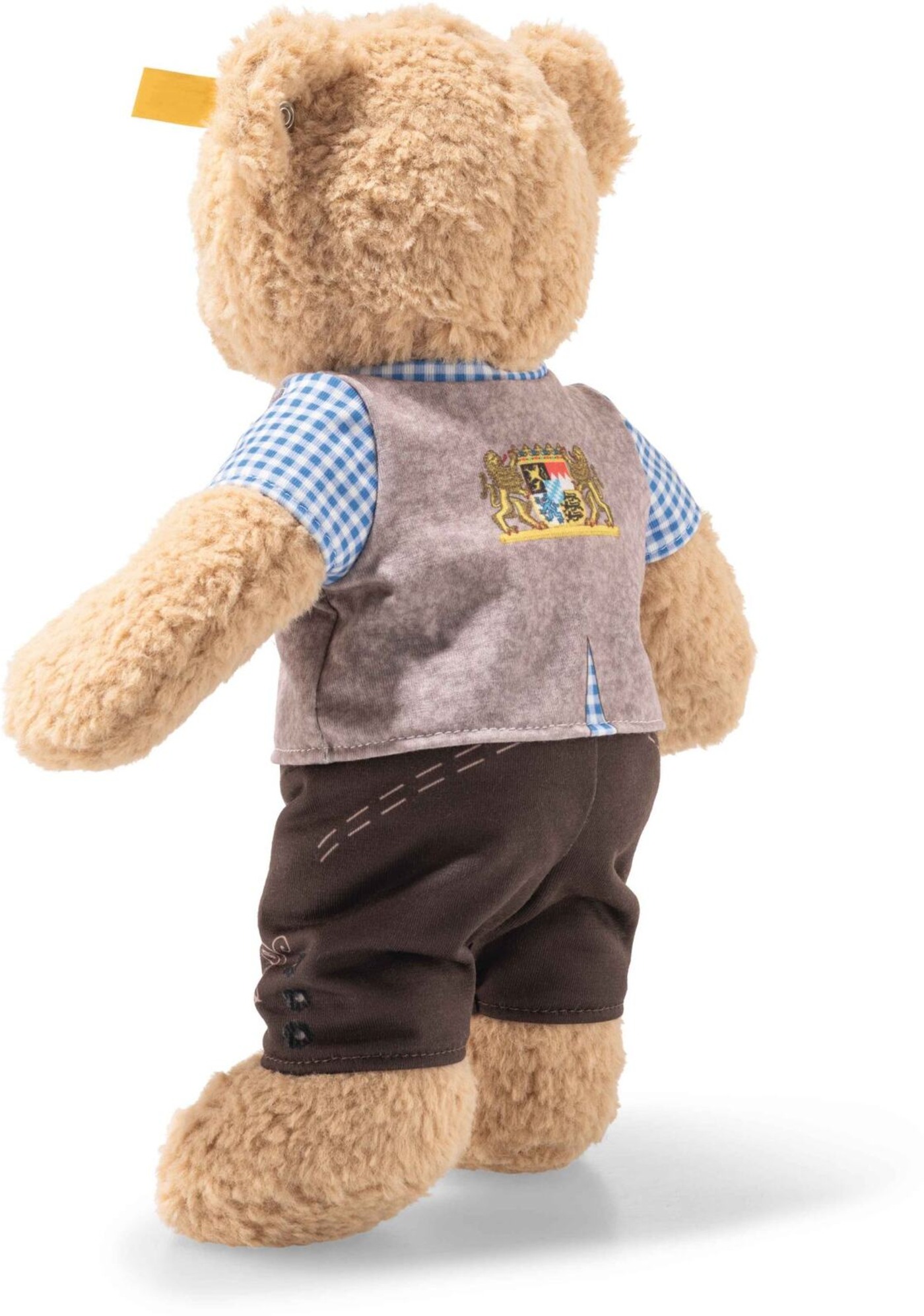 Ben trägt liebevoll gestaltete Kleidung, die von klassischer bayerischer Tracht inspiriert ist: stilisierte Lederhose mit detailreichen Ziernähten, ein blau-weiß kariertes Hemd und eine schicke Weste mit dem aufwändig bedruckten bayerischen Landeswappen auf dem Rücken – ein echter Hingucker.