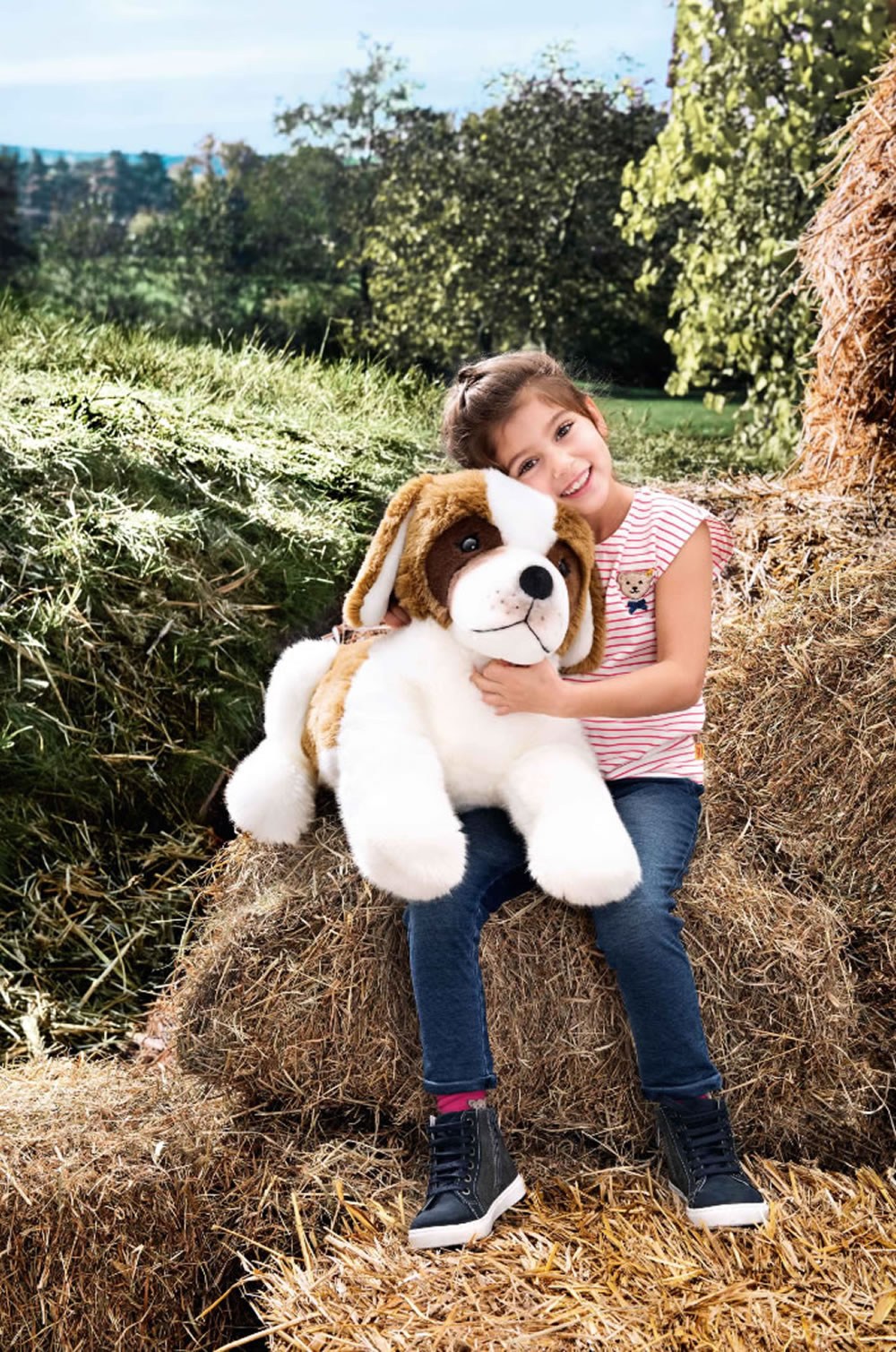 Bernhard, der 64 cm große, freundliche Bernhardiner, liebt es, geknuddelt zu werden und ganz lange zu kuscheln. Der in Braun und Weiß gehaltene Bernhardiner stupst Ihren Liebling mit seiner niedlichen, weißen, gestickten Schnauze, weil er gestreichelt werden möchte. Der Bernhardiner wird der beste Freund Ihres Sonnenscheins sein. Ob beim Arztbesuch, bei Verwandten oder beim Mittagsschlaf, Bernhard muss überall dabei sein.