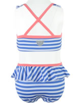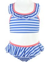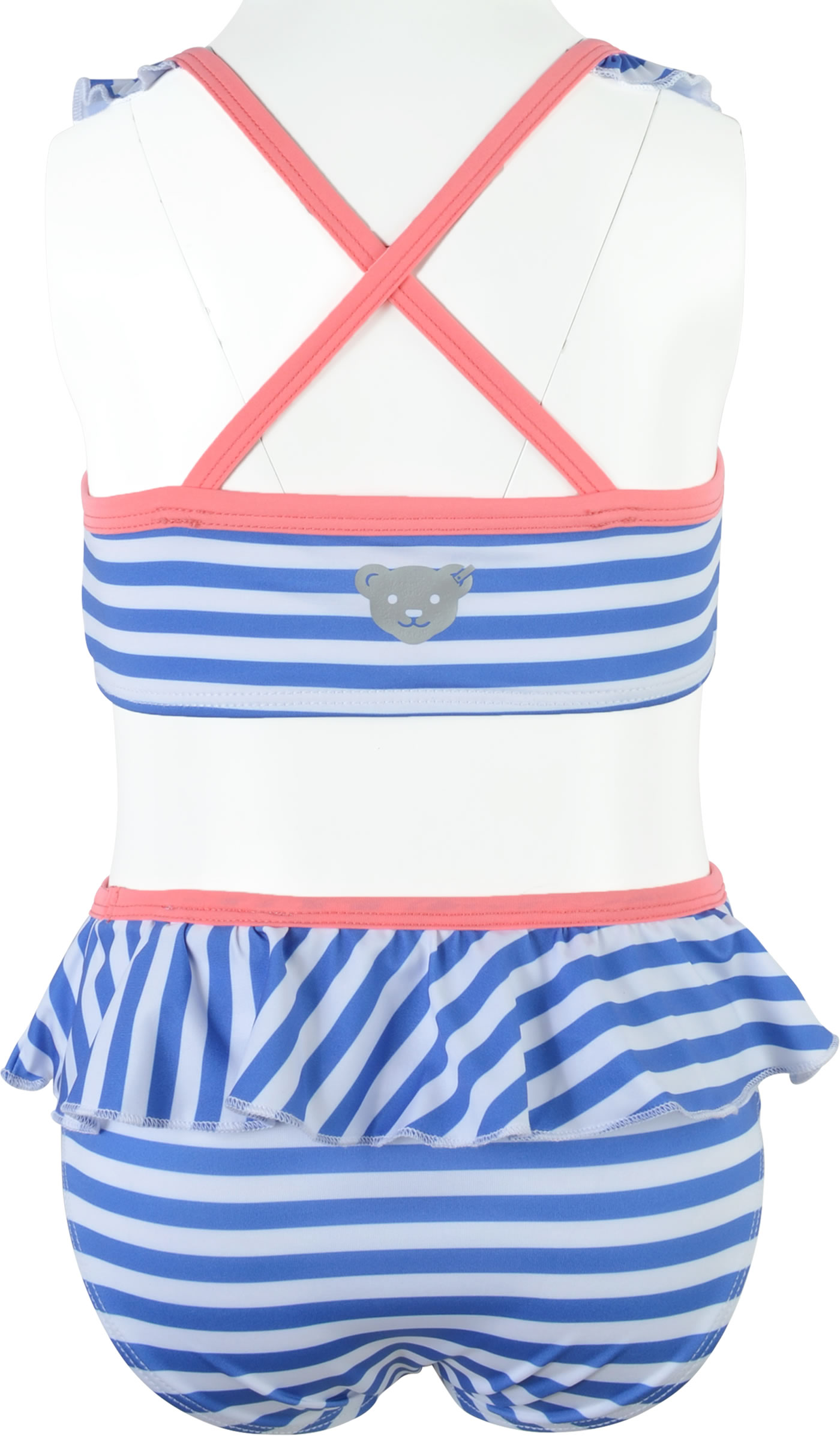 Hübscher Bikini von STEIFF. Tolle Details sind die verspielten Rüschenkanten und die rosa Kontraste am Höschenbund und an den Trägern. Der STEIFF Bär ziert den Rücken. Die Doppelträger des Oberteils kreuzen sich auf dem Rücken. Das Material mit UPF 50+ sorgt zusätzlich für Sonnenschutz.