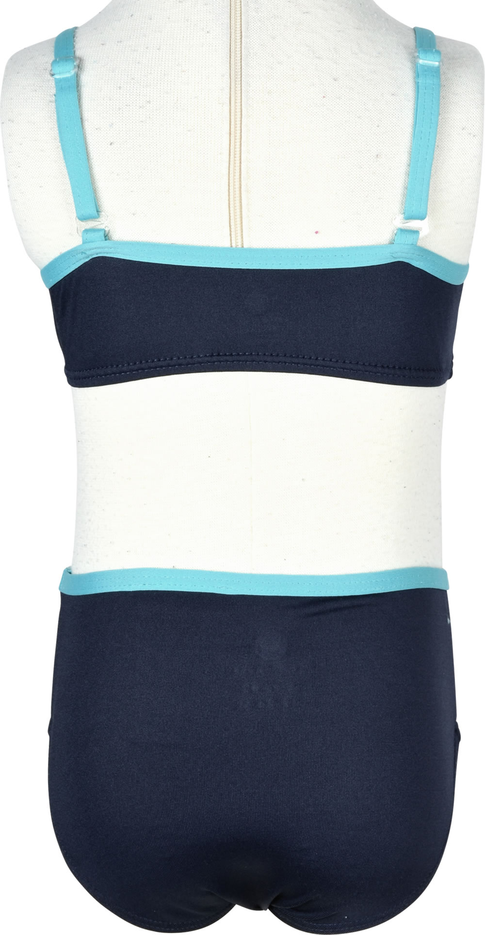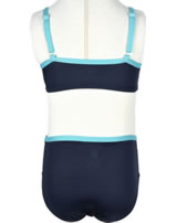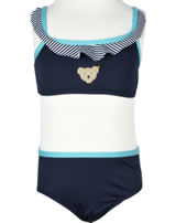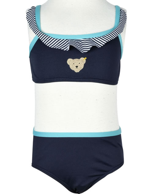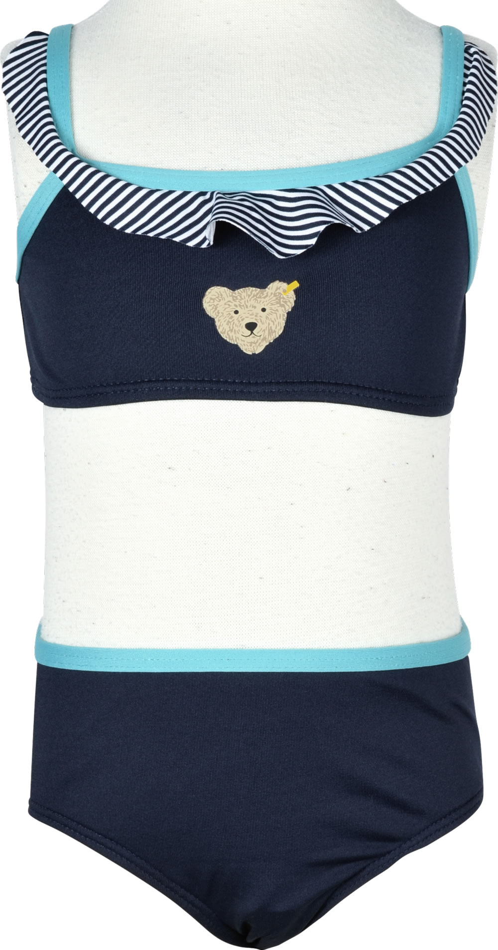 Hübscher Bikini von STEIFF in dunkelblau mit türkisen Paspeln. Ein tolles Detail ist die verspielte Rüschenkante auf der Vorderseite und der Steiff-Bärenkopf auf der Brust. Das Oberteil kann am Nacken-Träger in der Länge individuell verstellt werden. Kleine Wassernixen sind bestens geschützt durch den UV-Schutz 50.