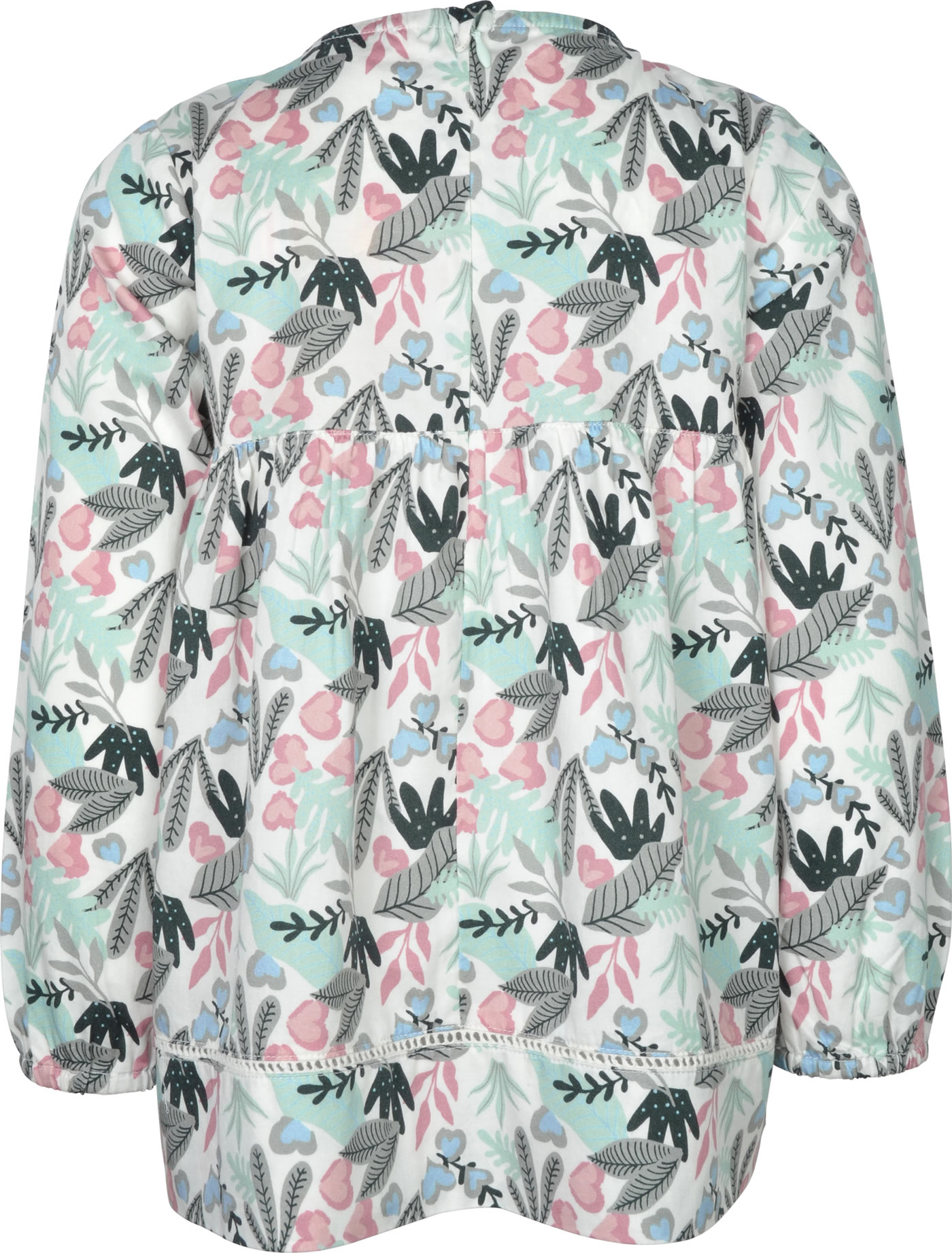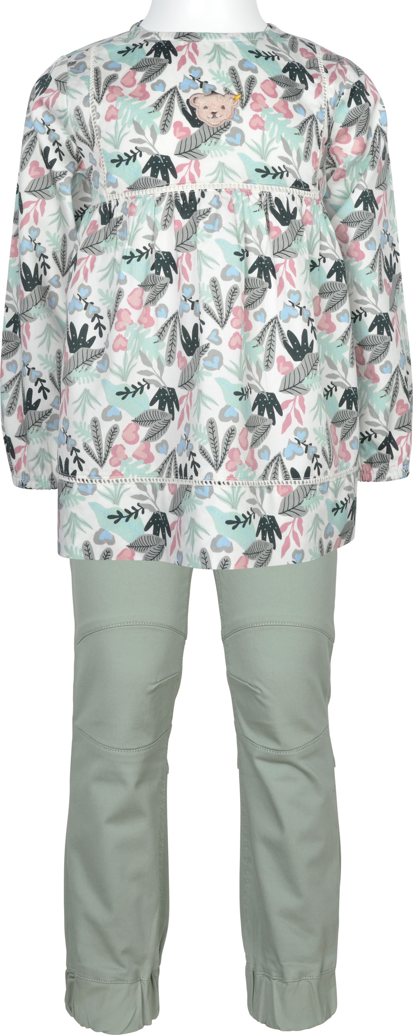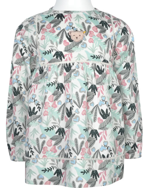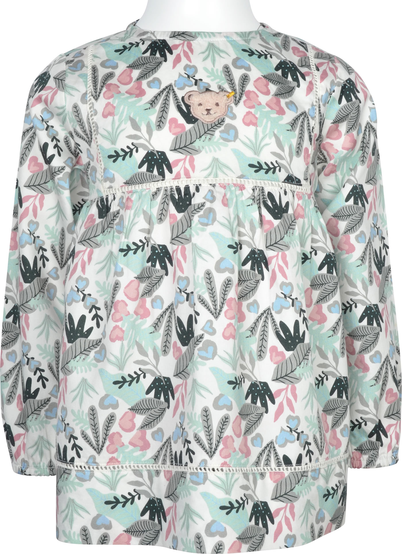 Weit geschnittene Bluse im Tunika-Stil mit Rundhals-Ausschnitt für Mädchen aus der Jungle Feeling Kollektion von STEIFF. Die Bluse mit langen Ärmeln ist aus festem Baumwollsoff wird mit einem Reißverschluss auf der Rückseite verschlossen. Schöne Details sind das bunte Dschungel-Muster, der STEIFF Bär auf der Vorderseite und die Lochstickerei auf der Brust und am Saum.