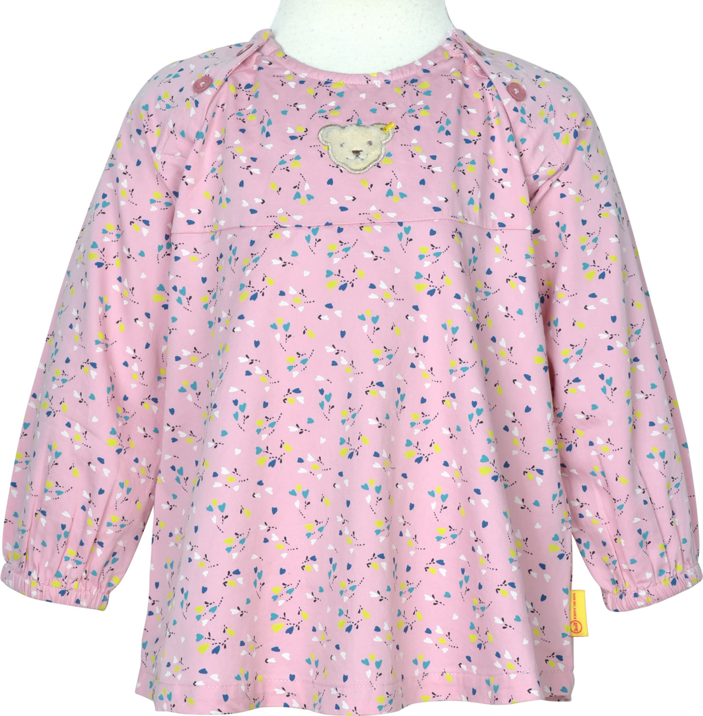Weit geschnittene Bluse mit Rundhals-Ausschnitt für Mädchen aus der Sweet Heart Kollektion von STEIFF. Die Bluse mit langen Armen wird mit Knöpfen auf den Schultern verschlossen. Der kleine STEIFF Bär ziert die Brust. Die geblümte Bluse ist aus festem Baumwollstoff und die Gummibündchen an den Ärmeln sorgen für einen guten Sitz.