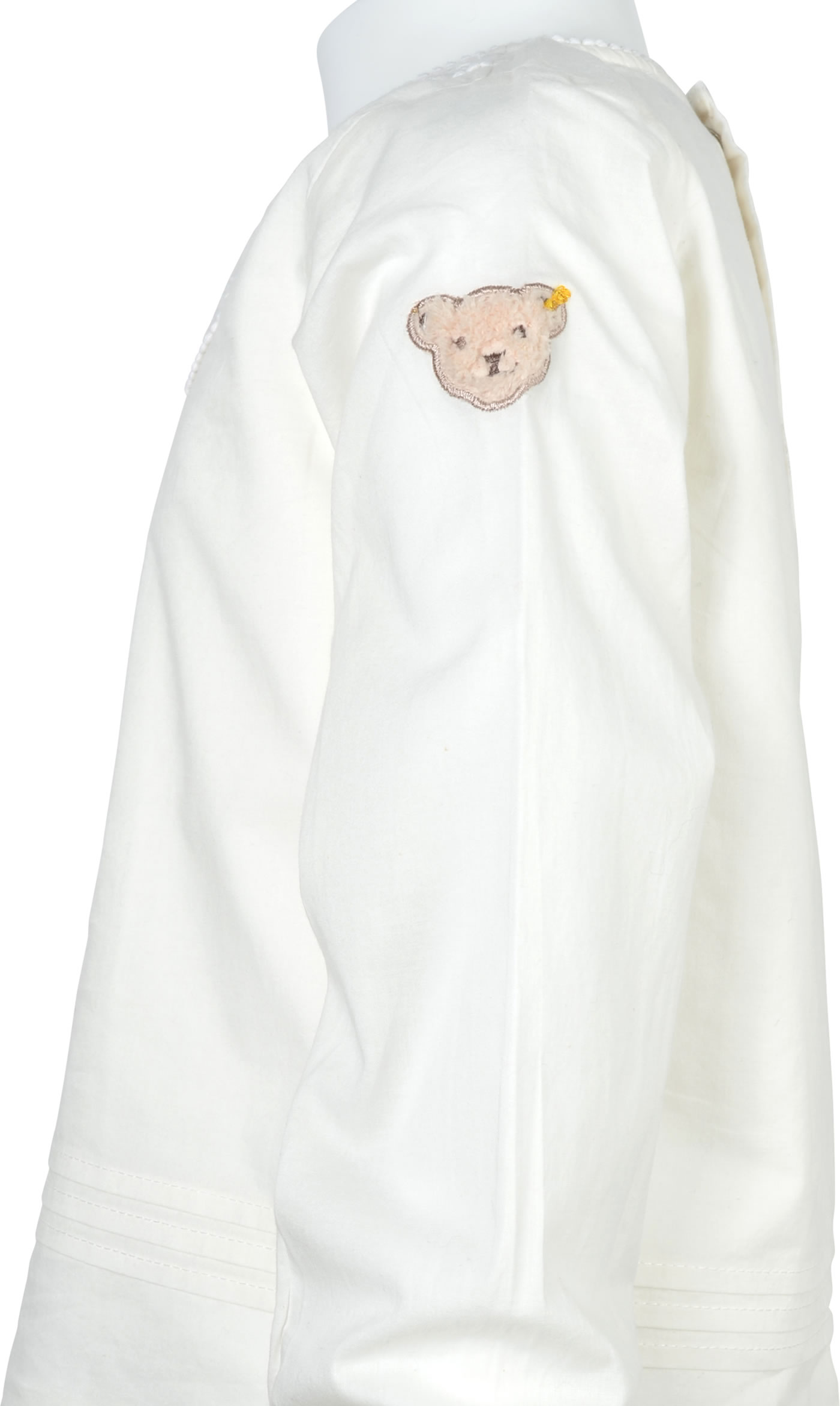 Festliche Bluse mit langen Ärmeln aus der Special Day-Kollektion von STEIFF. Die gerade geschnittene Bluse ist aus festem Baumwollstoff. Besonders schön sind die Stickereien am Halsausschnitt und der kleine STEIFF Bär auf dem linken Ärmel. Verschlossen wird die Bluse mit Druckknöpfen auf der Rückseite. Für Blickdichte sorgt das ebenfalls cremefarbene Futter, dass mit einer geschwungenen Bordüre unter dem Saum hervorschaut.