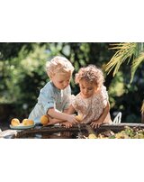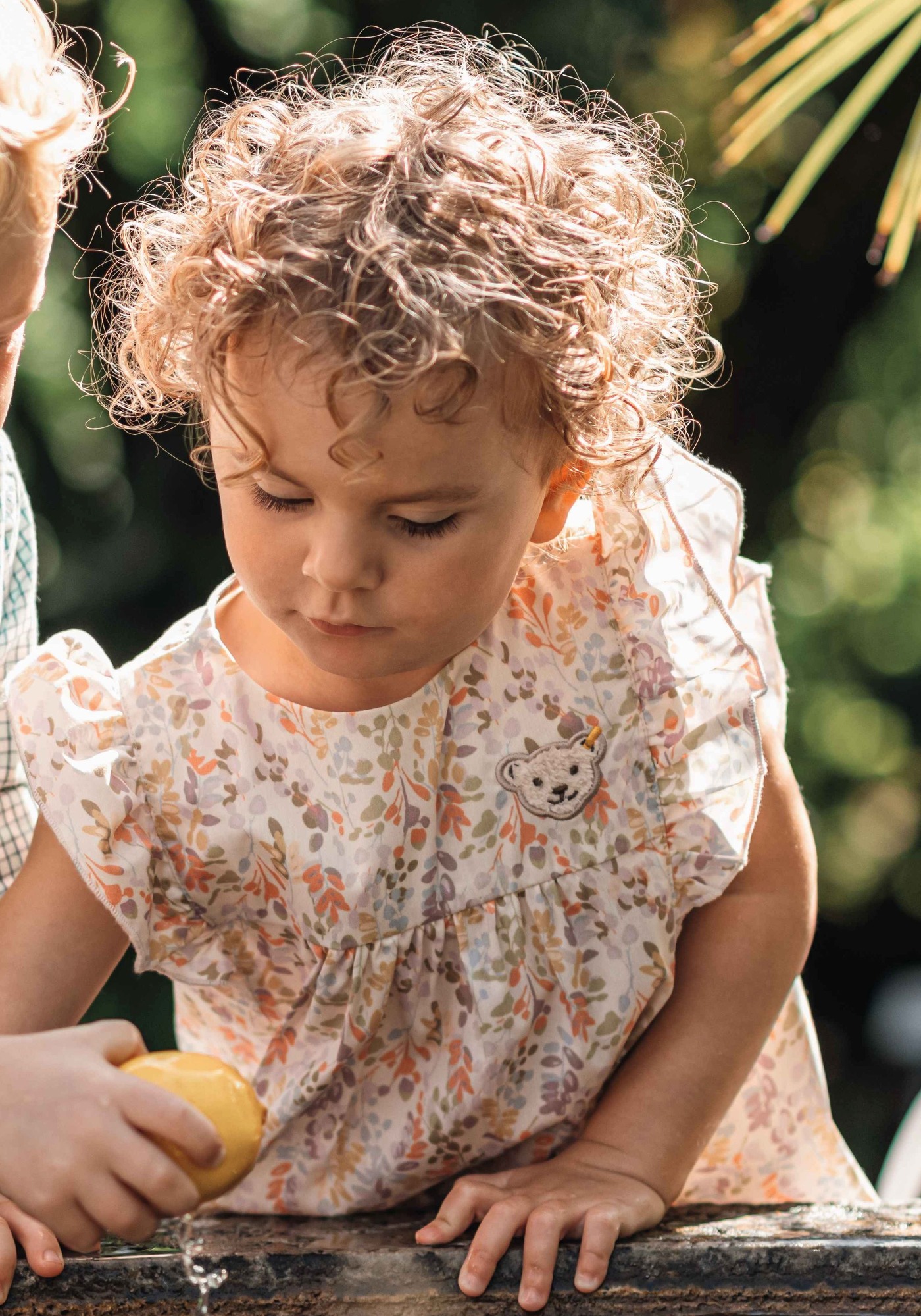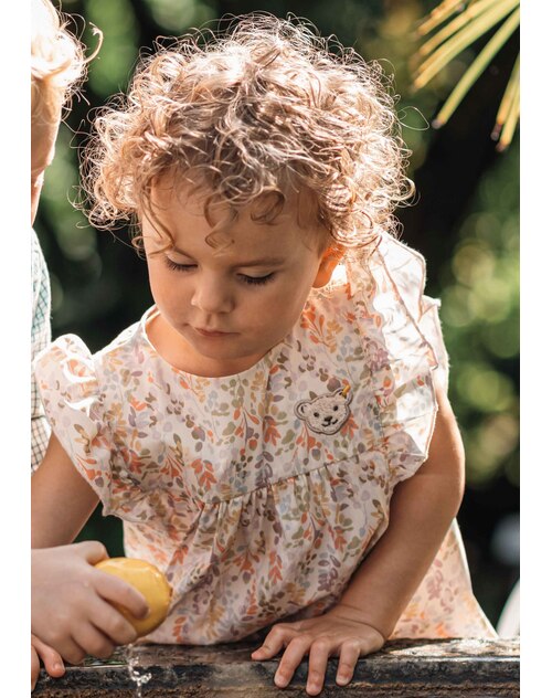 Sommerliches Blusentop für Mädchen aus der Blossom-Kollektion von STEIFF. Ein Reißverschluss auf der Rückseite erleichtert das An-und Ausziehen. Das luftige Blusentop in Baumwoll-Satin-Optik hat einen lockeren Schnitt und bietet viel Bewegungsfreiheit. Schöne Details sind die Raffungen auf der Brust und die gerüschten Flügelarme. Der kleine STEIFF Bär ziert die Vorderseite.