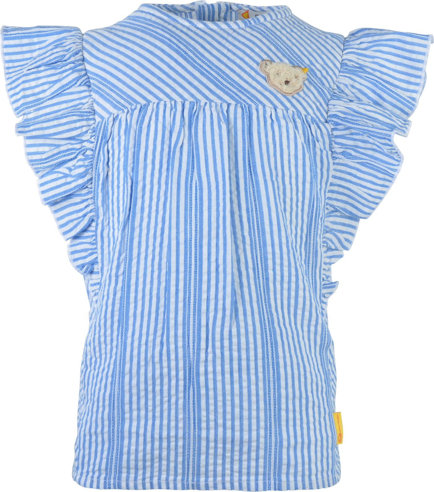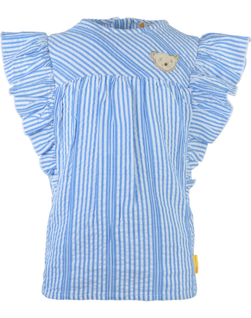 Sommerliche Bluse für Mädchen aus der Serendipity-Kollektion von STEIFF. Verschlossen wird die Tunika mit einem Reißverschluss auf der Rückseite. Die gestreifte Tunika aus Baumwollstoff in Seersucker-Qualität hat einen lockeren Schnitt und bietet viel Bewegungsfreiheit. Schöne Details sind die Raffungen auf der Brust und die gerüschten Flügelarme. Der kleine STEIFF Bär ziert die Vorderseite.