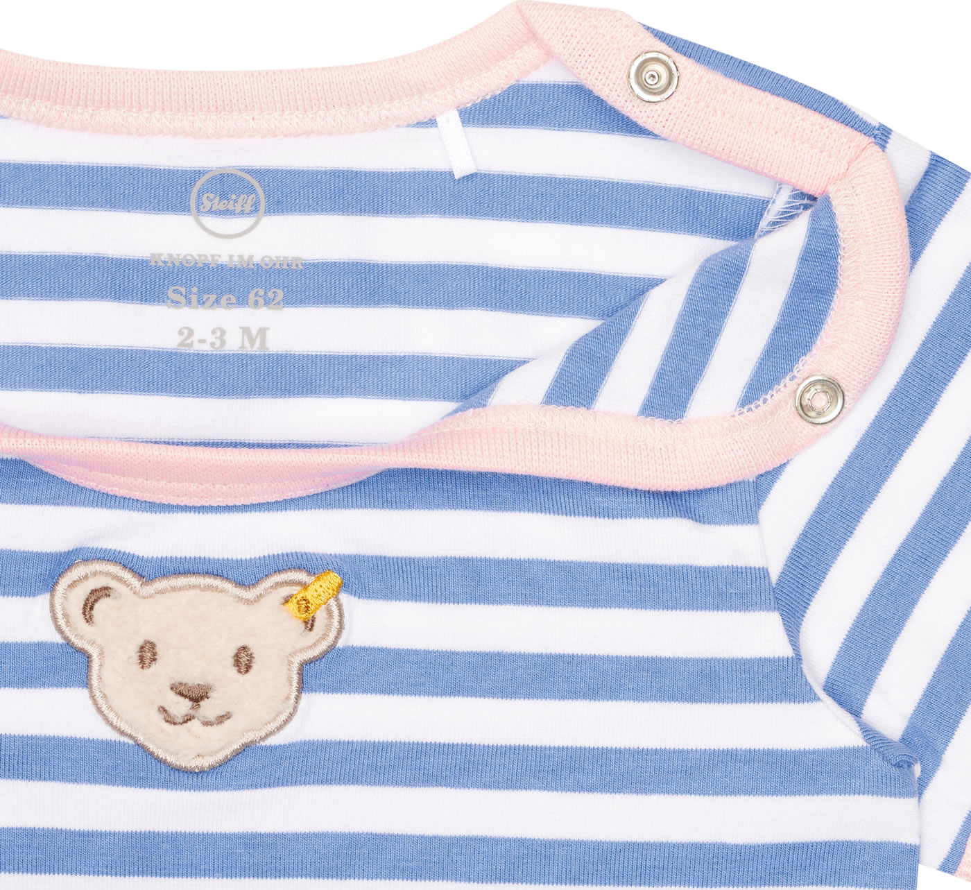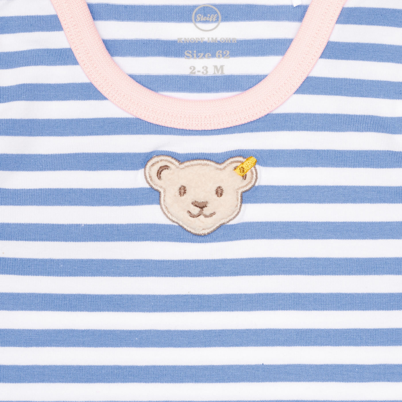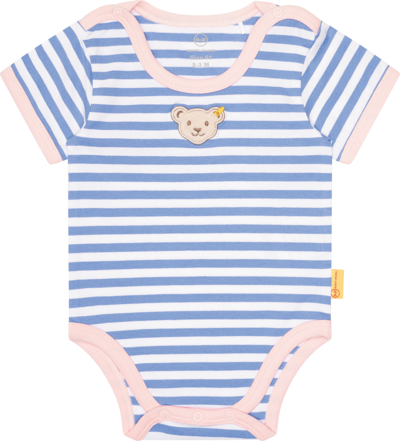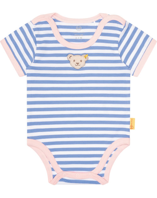Body aus Jersey mit kurzen Ärmeln für Mädchen aus der Serendipity-Kollektion von STEIFF. Das hübsche Streifenmuster und der STEIFF-Bär auf der Brust sind schöne Details. Druckknöpfe im Schritt und auf der Schulter erleichtern das Anziehen und Wickeln. Das weiche Material bietet einen hohen Tragekomfort.