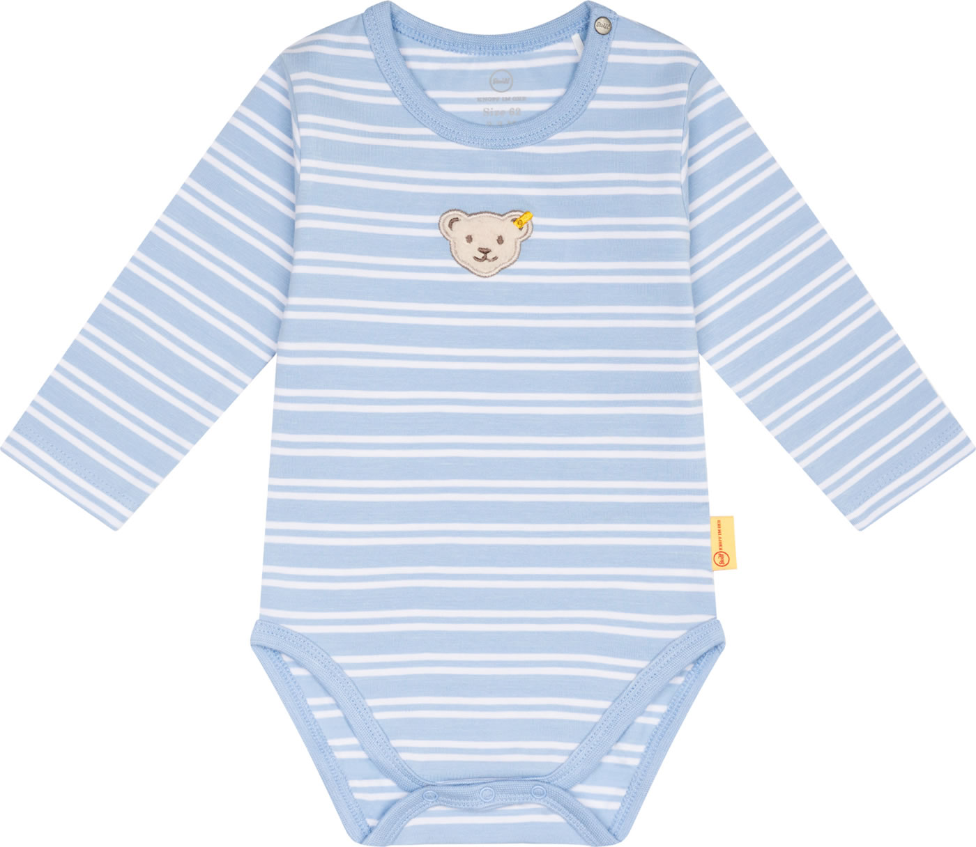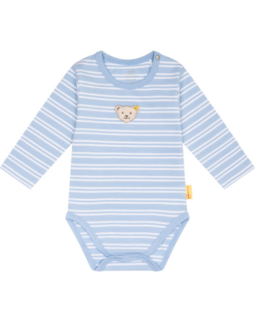 Body mit langen Ärmeln für Jungen aus der Elephant Ride-Kollektion von STEIFF. Auf der Brust befindet sich der STEIFF-Bär. Die Druckknöpfe im Schritt und auf der Schulter helfen beim An- und Ausziehen. Der gestreifte Body ist aus weichem Jersey und bietet einen hohen Tragekomfort.