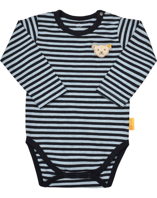 Body mit langen Ärmeln für Jungen aus der Polar Friends-Kollektion von STEIFF. Auf der Brust befindet sich der STEIFF-Bär. Die Druckknöpfe im Schritt und auf der Schulter helfen beim An- und Ausziehen. Der gestreifte Body ist aus weichem Jersey und bietet einen hohen Tragekomfort.
