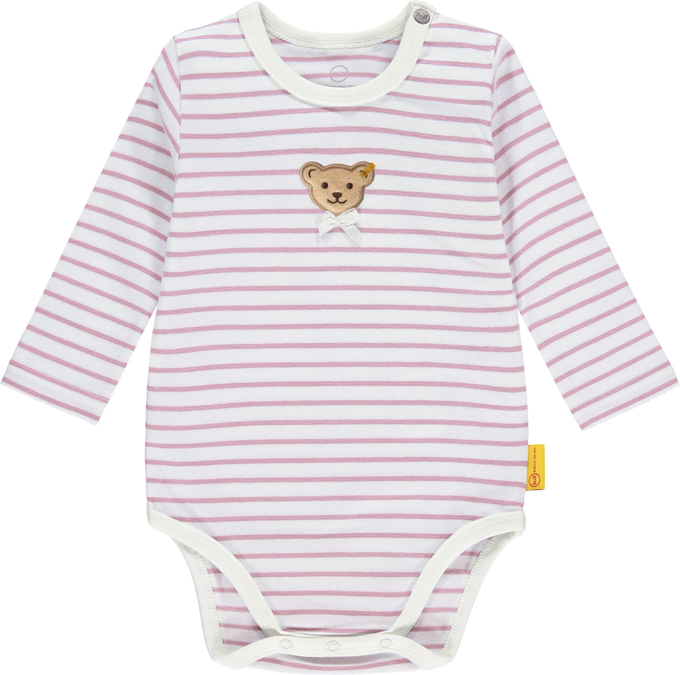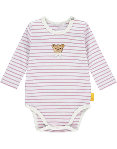 Gestreifter Body mit langen Ärmeln für Mädchen aus der Sweet Heart-Kollektion von STEIFF. Den kleinen STEIFF Bären auf der Brust verziert eine Schleife. Druckknöpfe auf der Schulter erleichtern das An- und Ausziehen. Das weiche Material bietet einen hohen Tragekomfort.