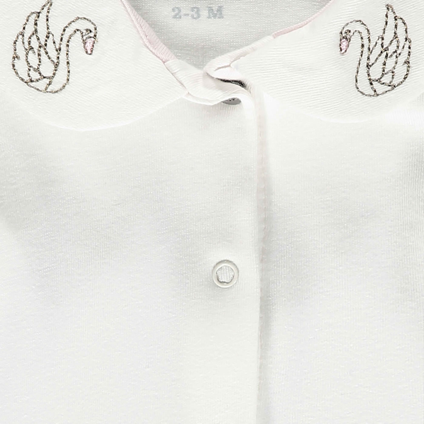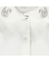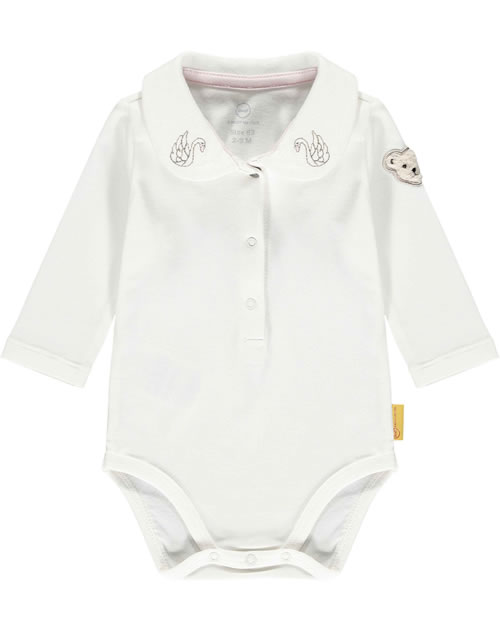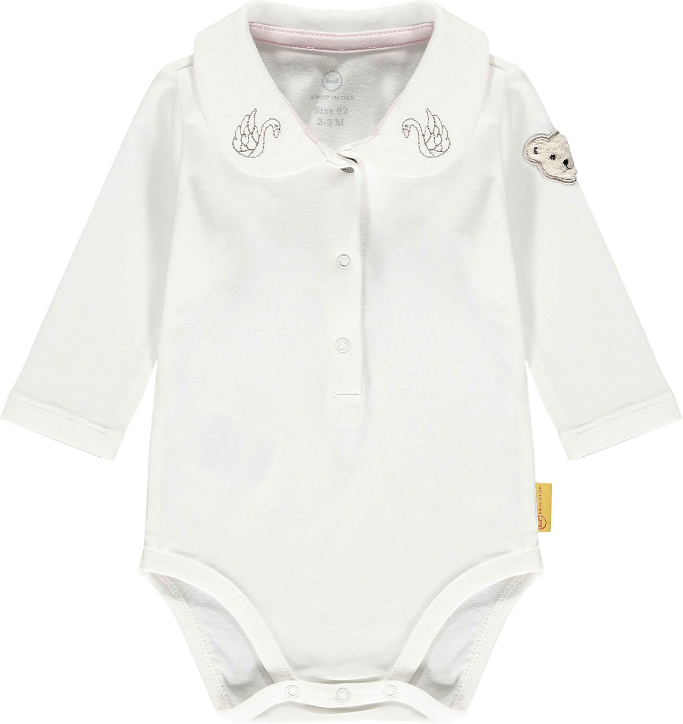 Hübscher Mädchen-Body mit langen Armen und Bubi-Kragen aus der aktuellen Fairytale-Kollektion von STEIFF. Die bezaubernde Schwanen-Stickerei auf dem Kragen sind ein besonders schönes Detail. Auf dem linken Arm befindet sich ein kleiner Steiff Teddy-Patch. Druckknöpfe an der Brust und im Schritt erleichtern das An- und Ausziehen.