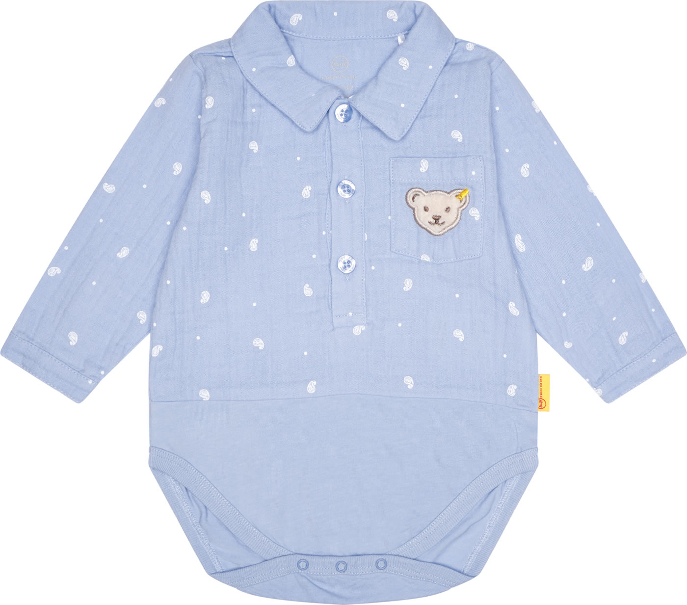 Body mit langen Ärmeln und Kragen für Jungen aus der Elephant Ride-Kollektion von STEIFF. Der STEIFF Bär befindet sich als Print auf der Brusttasche. Druckknöpfe im Schritt und Knöpfe auf der Brust erleichtern das An-und Ausziehen. Der obere Teile des Bodys ist aus weichem Seersucker-Material.