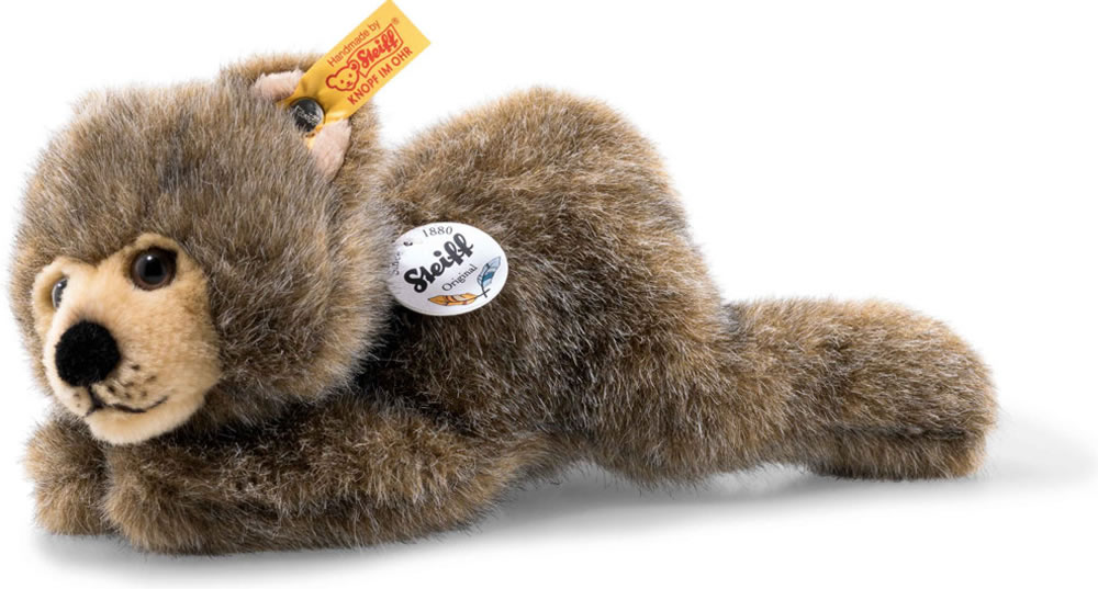 Der braun gespitzte, liegende Basti Braunbär ist 20 cm groß. Er trägt eine Halsmarke mit Federn. Der kuschelweiche Abenteurer mit den beigen Innenohren und der süßen schwarzen Nase tapst auf seinen weichen, blonden Sohlen durchs Kinderzimmer. Das freundliche blonde Gesicht wird umrahmt von braun gemalten Bartstoppeln.