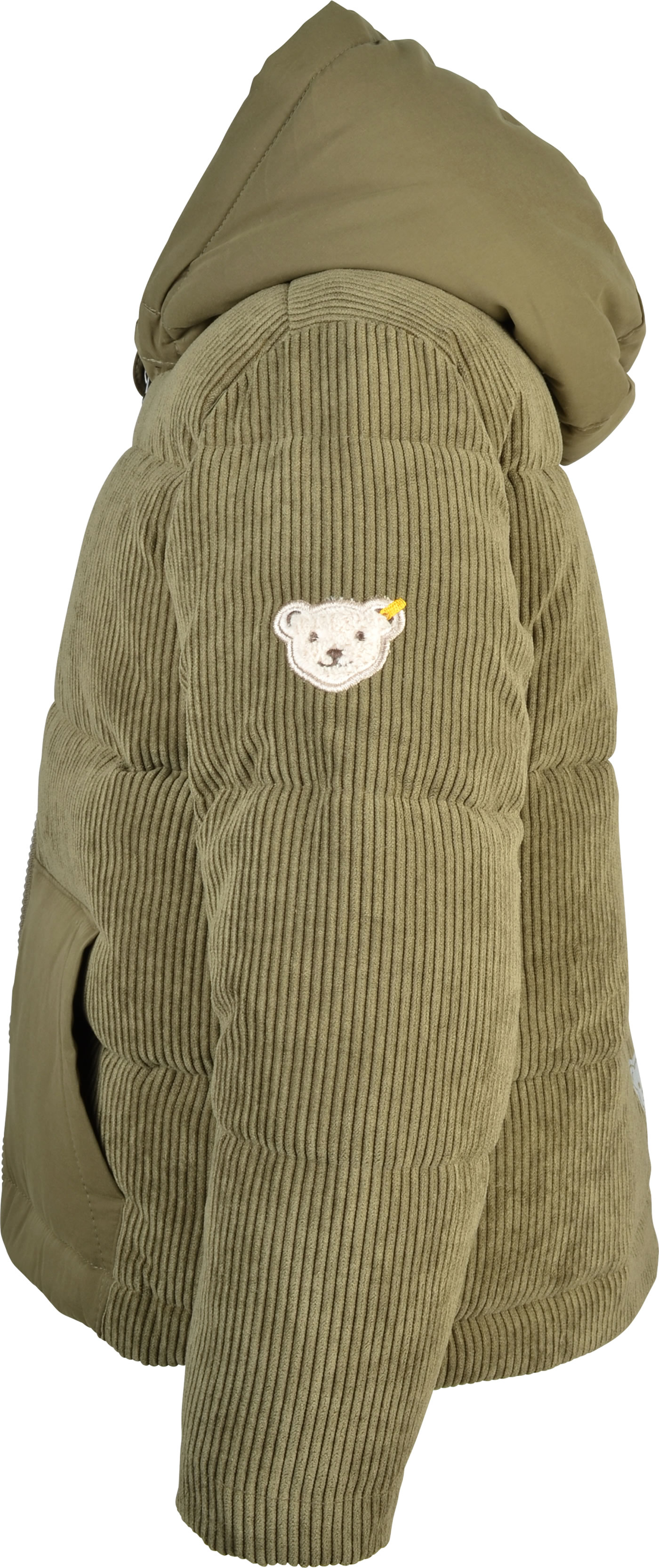 Coole Jacke aus weichem Breitcord für Jungen von STEIFF aus der Wolfs Land-Kollektion. Der STEIFF Bär befindet sich auf der dem linken Arm. Die Jacke ist warm gefüttert und am Oberkörper zusätzlich mit Fleece unterlegt und hält dadurch schön warm. Die Kapuze ist abknöpfbar. Zwei Känguru-Taschen bieten Platz für Kleinigkeiten. Auf der Rückseite sorgt ein Reflektor-Teddybär für gute Sichtbarkeit.