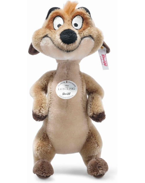 Zu den Löwen Simba und Nala aus „Disney Der König der Löwen“ gesellt sich der fröhliche Timon: Er und sein Freund Pumbaa zeigen Simba die Vorzüge eines sorgenfreien Lebens. Bis Nala die beiden angreift... Das Erdmännchen Timon erscheint in feinstem hellbraunen Mohair, mit breitem Grinsen, Airbrushdetails und von Hand gestickten Augen. Am Ende gilt dann auch auf dem Königsfelsen: „Hakuna Matata – alles in Ordnung!“