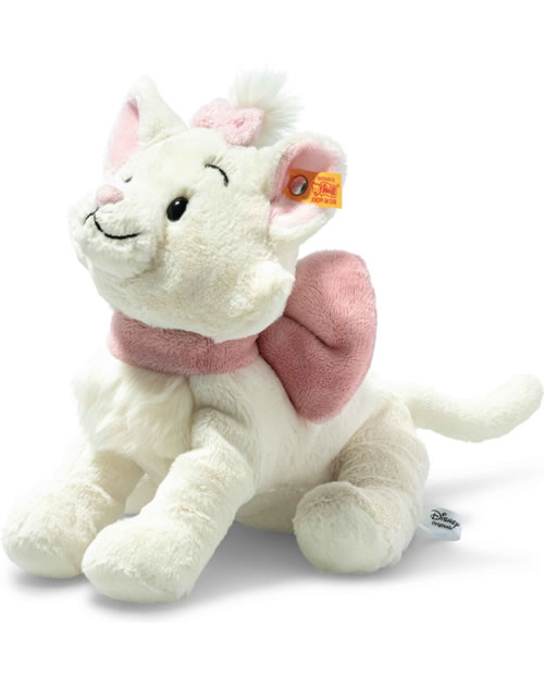 Soft Cuddly Friends Disney Marie ist die erklärte Romantikerin unserer Spieltierserie mit Disney Lizenz – und etwas verwöhnt: Das 24 cm große kuschelweiche Kätzchen schmiegt sich am liebsten in die Arme, lässt sich streicheln und belohnt dafür mit einem zauberhaften Augenaufschlag. Fedrige Elemente und roséfarbene Akzente – Schleifchen und Halsband, Innenohren und Näschen – vervollkommnen ihr weißes Plüschfell. Augenbrauen und Mund, beide sorgfältig gestickt, betonen ihren Charakter, ihr Edelstahl „Knopf im Ohr“ harmoniert perfekt... Verlieben empfohlen!