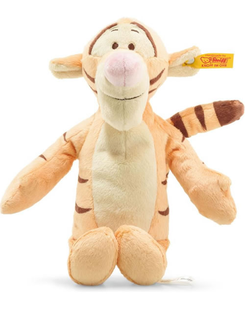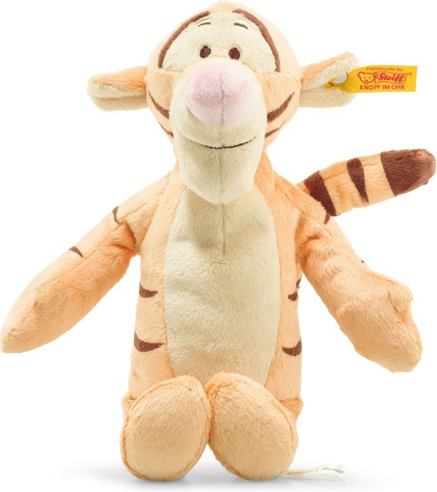 Tigger will immerzu spielen! Mit großem Elan und nimmermüde kommt dieser Freund ins Kinderzimmer herein. Er ist 24 cm groß und aus orange-cremefarbigem Plüsch für babysanfte Haut gefertigt. Die braunen Tigerstreifen sind aufgedruckt. Wunderschön gestickt sind die Augen, die Augenbrauen und der Mund. Die rosa Nase verleiht ihm das verschmitzte Aussehen. Bauch, Gesicht und Innenohren sind gelb. Eine Quietsche ist im Bauch eingearbeitet. Genau richtig für Tigger: Stürmisch und temperamentvoll und dazu ein perfektes Quietschen. Mit ihm kann man prima herumhüpfen, springen, tanzen und lachen. Nimmt man ihn an der Hand, so zeigt er sich von seiner ruhigen und weichen Seite. Denn auch beim Schmusen und Kuscheln fühlt er sich so richtig wohl. Und abends, wenn beide Spielkameraden im Bett liegen, träumen sie von den nächsten Abenteuern. Oder erzählen von den Weitsprüngen, die sie am Tag gemacht haben.