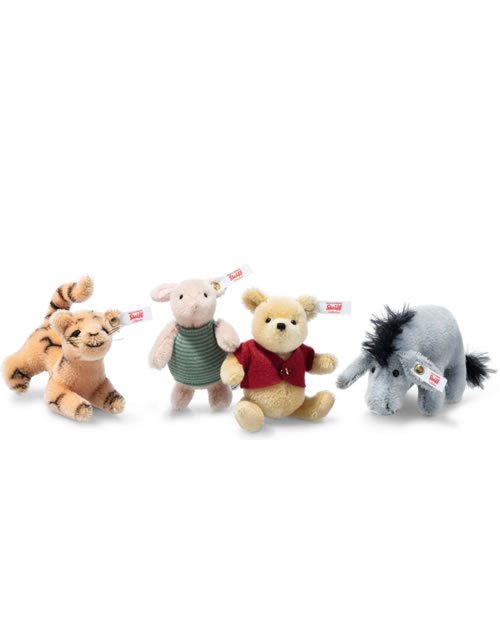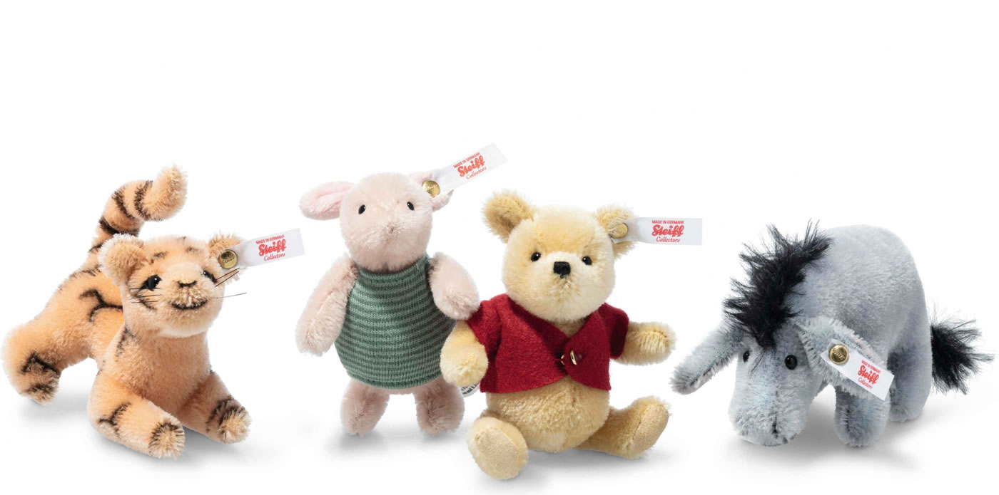 1926 macht A.A. Milne in „Winnie Puuh“ die Stofftiere seines Sohnes Christopher Robin zu Kinderbuchhelden – dank Disney sind schönste Filme daraus entstanden! Mit dem Winnie Puuh Set aus feinstem Mohair präsentiert Steiff erstmals ein Komplettset der Freunde aus dem Hundertsechzig-Morgen-Wald! Winnie Puuh, 5-fach gegliedert, trägt eine Weste aus rotem Wollfilz. Ferkel grüßt, mit beweglichen Armen, in einem grünen Baumwoll-Ringelpulli. Tigger und I-Aah lieben ihr Airbrushdekor: tolle Streifen, schicke Nüstern ... HAPPY ANNIVERSARY!
