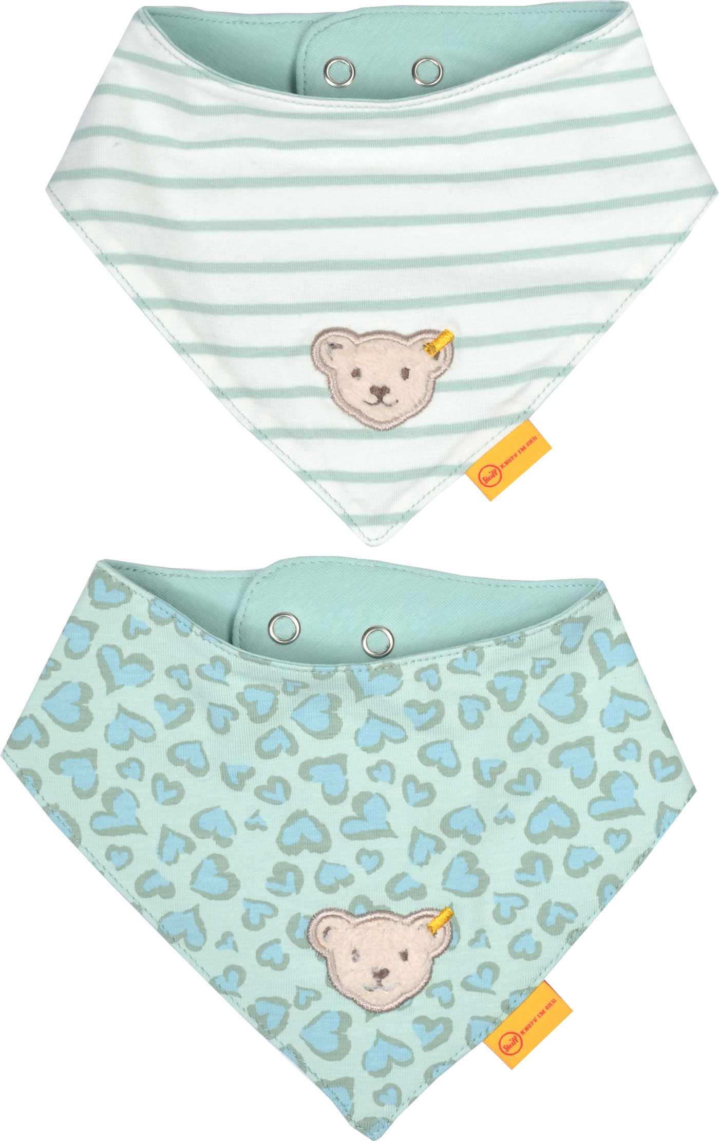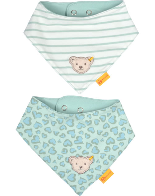 Halstuch-Set für Mädchen von STEIFF aus der Jungle Feeling-Kollektion. Auf der Vorderseite befindet sich der kleine STEIFF Bär. Die Halstücher aus doppellagigem Jersey haben zwei Druckknöpfe, so dass sich die Weite individuell einstellen läßt.