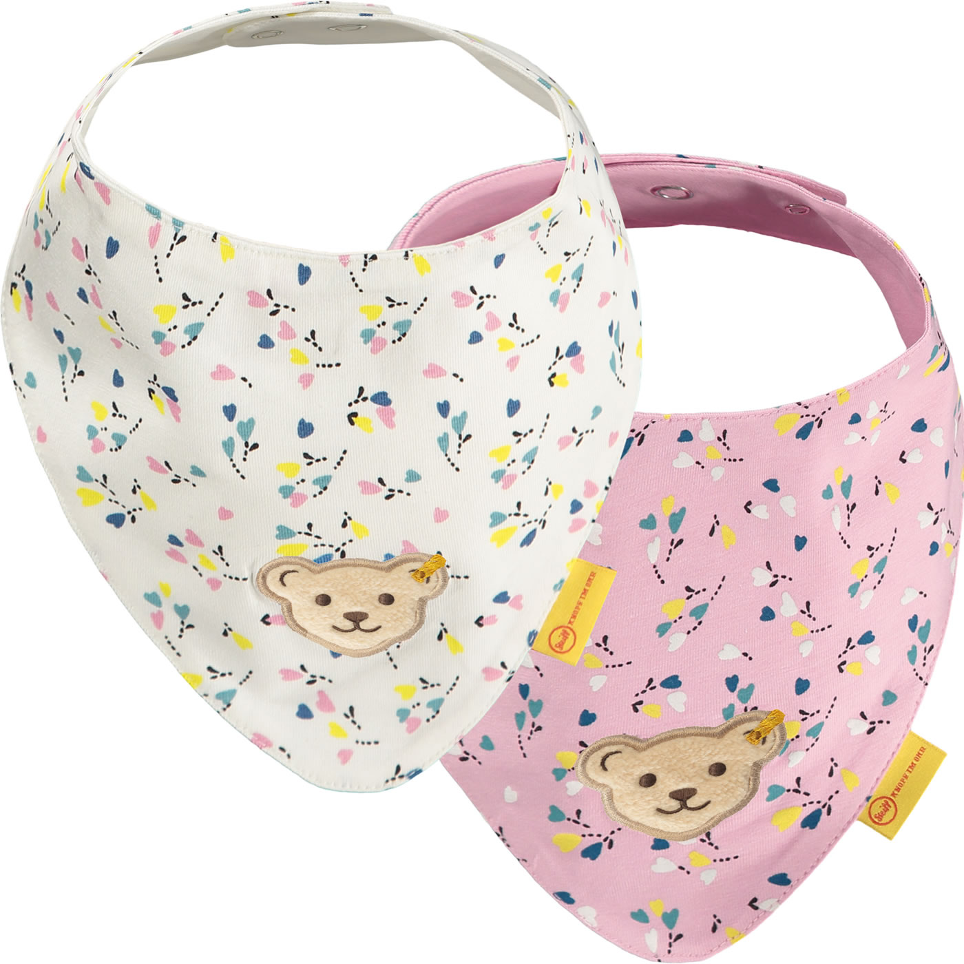 Halstuch-Set für Mädchen von STEIFF aus der Sweet Heart-Kollektion. Auf der Vorderseite befindet sich der kleine STEIFF Bär. Die Halstücher sind aus weichem Baumwoll-Jersey und haben zwei Druckknöpfe, so dass sich die Weite individuell einstellen läßt.