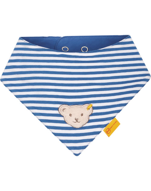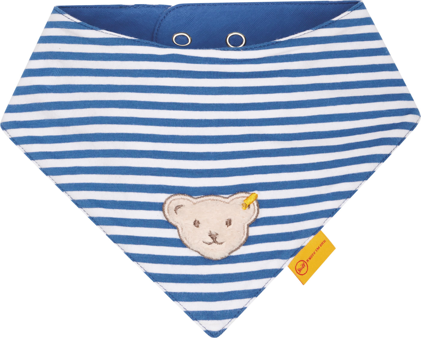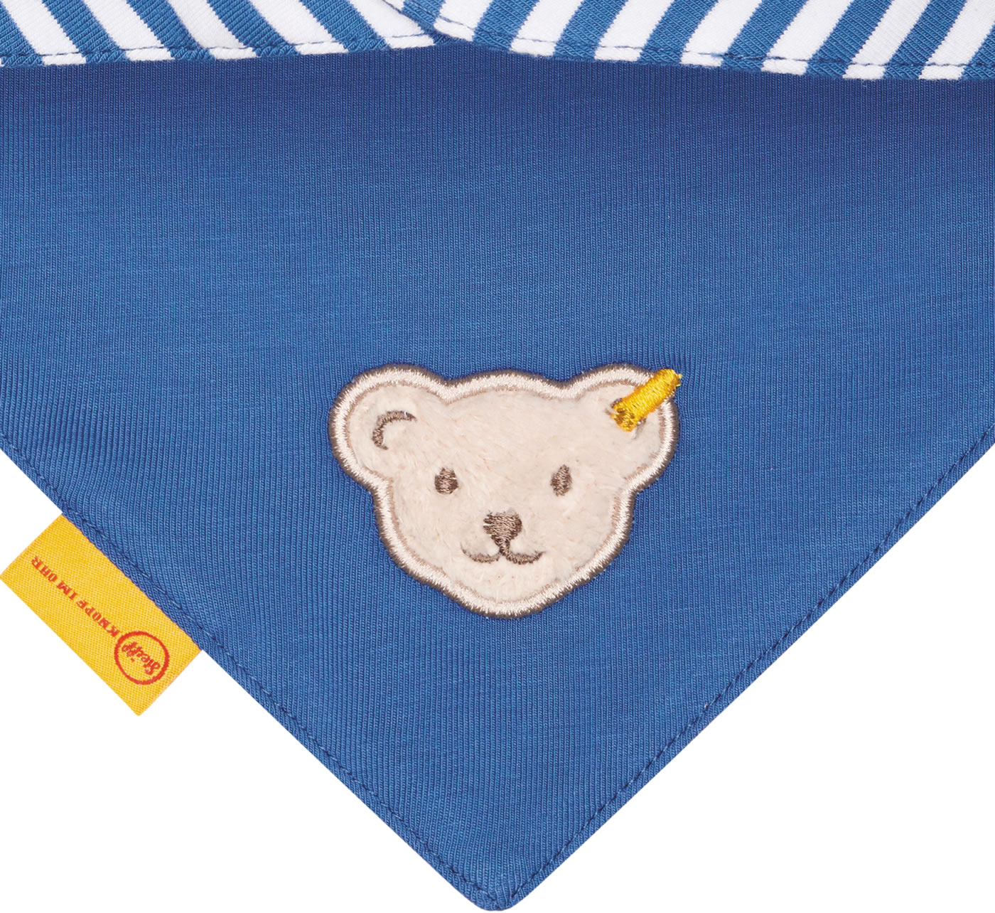 Doppellagiges Halstuch aus Jersey-Material von STEIFF aus der Happy Hippo-Kollektion. Der kleine STEIFF Bär verziert die geringelte und die unifarbene Seite. Geschlossen wird das Halstuch mit zwei Druckknöpfen, mit denen sich auch die Weite verstellen läßt.