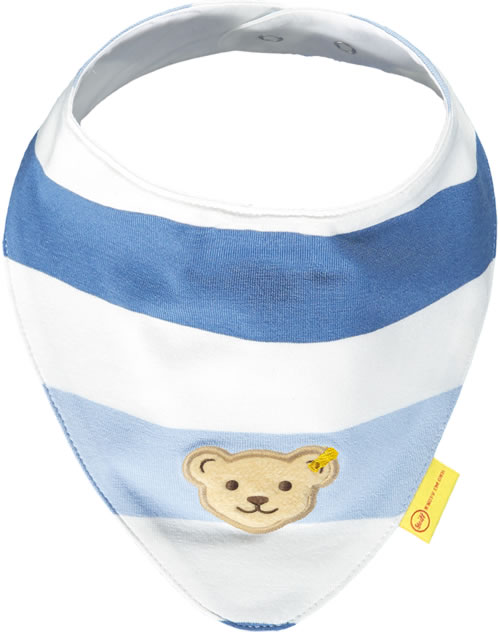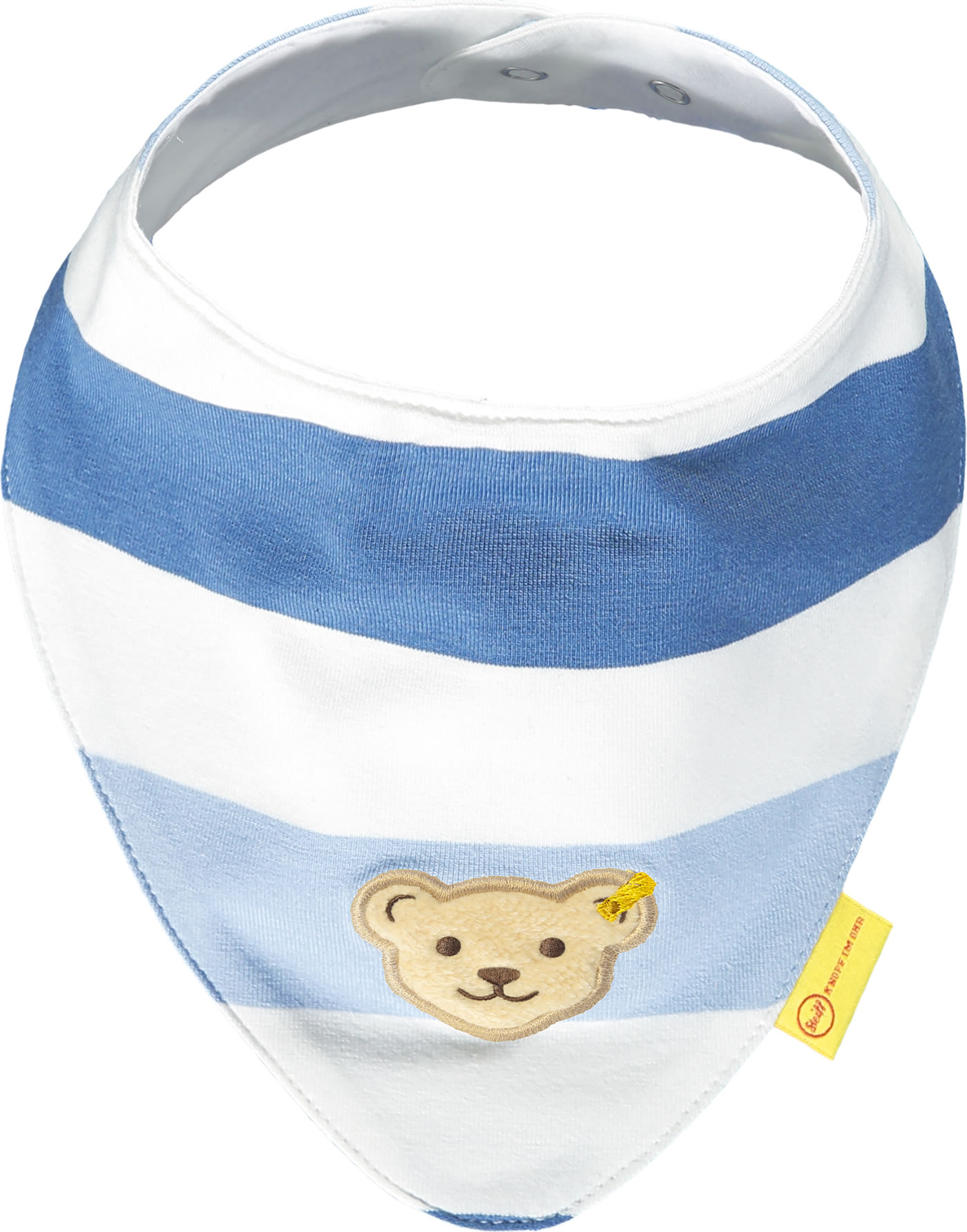 Schönes Halstuch aus weichem Baumwoll-Stoff von STEIFF aus der Hello Summer-Kollektion. Auf der Vorderseite befindet sich der kleine STEIFF Bär. Geschlossen wird das Halstuch mit zwei Druckknöpfen, mit denen sich auch die Weite verstellen läßt.