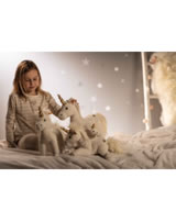 Im 27 cm großen, stehenden Soft Cuddly Friends Unica Einhorn sind Granulatsäckchen in die weißen Hufe eingearbeitet, damit es gut stehen kann. Es ist aus weißem, kuschelweichem Plüsch und hat zwei glitzernde goldene Sterne an der linken Gesäßseite. Die Augen sowie die gestickten Nasenlöcher sind in Schwarz und die Innenohren sind rosafarben. Die weiße Mähne und der Schweif sind in längerem Plüsch gearbeitet. Ein außergewöhnlich schönes Kuscheltier, das sicherlich die Fantasie des Kindes anregt und damit für ein ideenreiches Spielerlebnis sorgt.