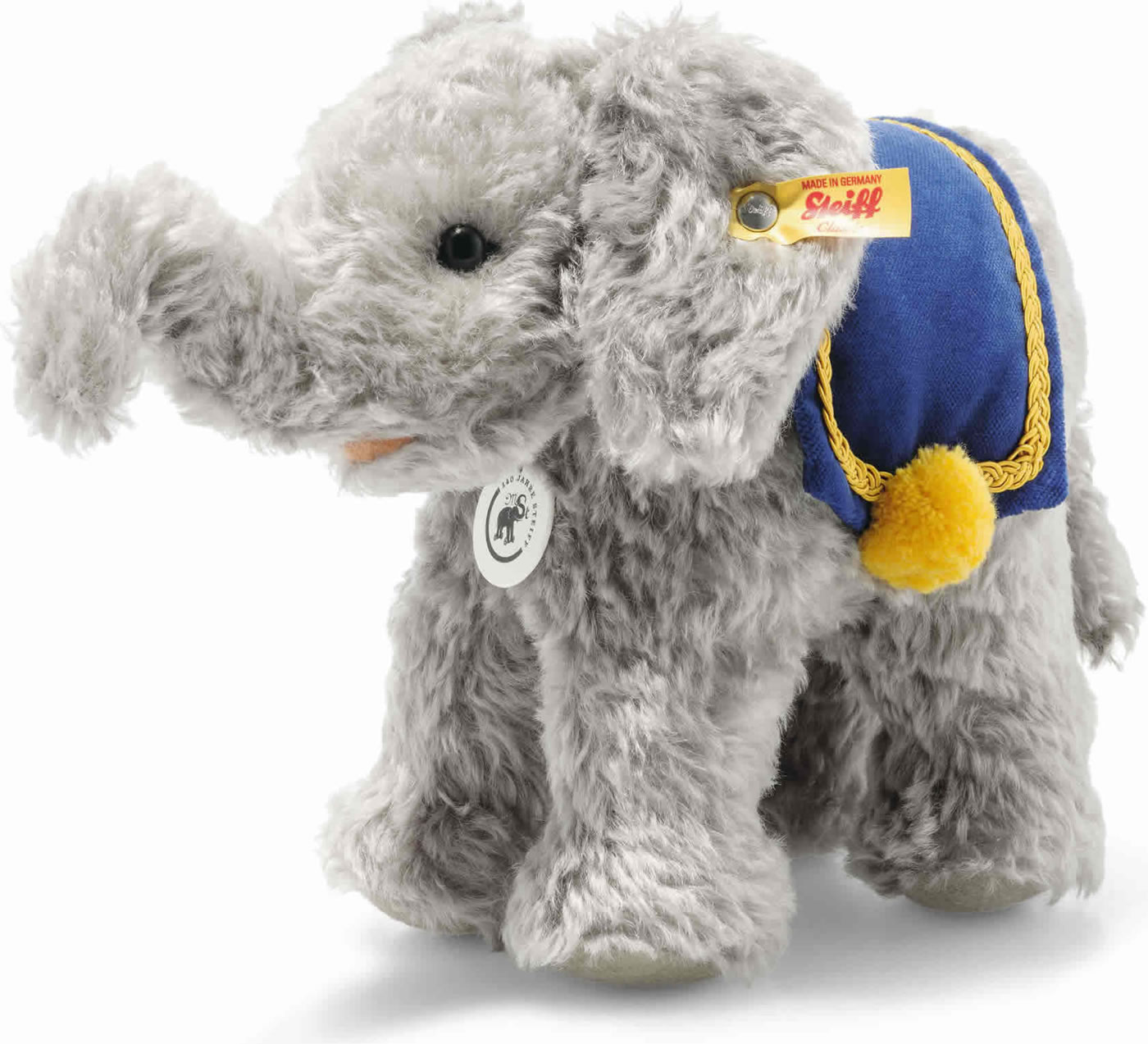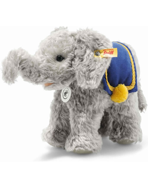 1880 bildet das erste als Spielzeug verkaufte Elefäntle aus der Werkstatt der Margarete Steiff weltweit die Geburtsstunde von Spieltieren aus Plüsch. Wir begehen dieses Jubiläum 2020 mit der 140 Jahre Kollektion: Alle ihre Vertreter tragen das besondere Elefäntle-Logo „140 Jahre Steiff“. Der Elefant ist 22 cm groß und aus feinstem grauen Mohair gefertigt. Die Augenwinkel und die Innenohren sind mit aufwendiger Airbrushtechnik versehen. Ebenso der Schweif. Die Sohlen sind aus samtweichem Filzmaterial. Besonders dekorativ ist die hübsche Satteldecke auf dem Rücken. Diese ist mit einer Borte und einem Pompom verziert.
