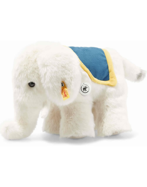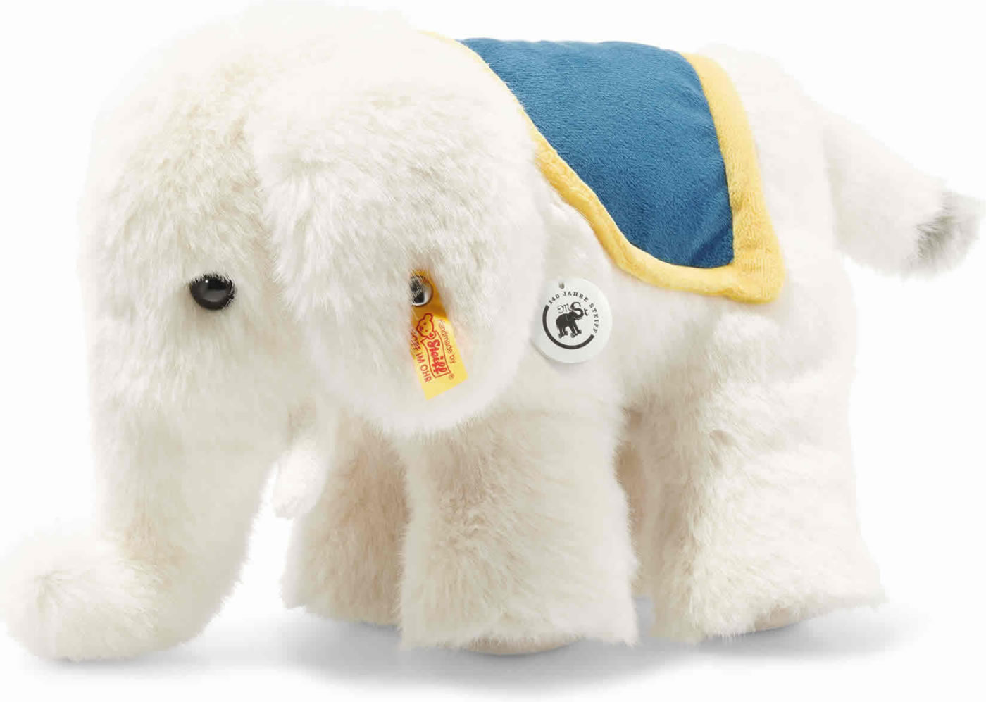 1880 bildet das erste als Spielzeug verkaufte Elefäntle aus der Werkstatt der Margarete Steiff weltweit die Geburtsstunde von Spieltieren aus Plüsch. Wir begehen dieses Jubiläum 2020 mit der 140 Jahre Kollektion: Alle ihre Vertreter tragen das besondere Elefäntle-Logo „140 Jahre Steiff“. Das besonders edle, 25 cm große Elefäntle mit den typischen Stoßzähnen wurde aus kuschelweichem weißen Plüsch gefertigt. Die Innenohren und die Fußsohlen sind beige. Die angenähte Satteldecke ist blau und hat einen gelben Rand. Die Schweifspitze ist Grau.