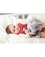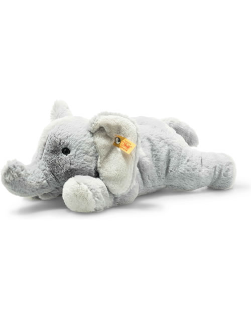Die 28 cm große Elna Elefant aus der Familie der Steiff Soft Cuddly Friends besitzt große, weiße Ohren – natürlich mit „Knopf im Ohr“ – und weiße Pfoten, dazu einen gemütlichen Elefantenkörper mit Granulatsäckchen und den typischen Falten aus kuschelweichem hellgrauem Plüsch. Ihren Rüssel trägt Elna aufwartend, sanft nach oben geschwungen, ihren naturgetreuen Mund hat sie leicht geöffnet, die schwarzen Augen scheinen zu lächeln. Elna Elefant ist eine Nachfolgerin des beliebten Steiff Schlenker-Elefanten.