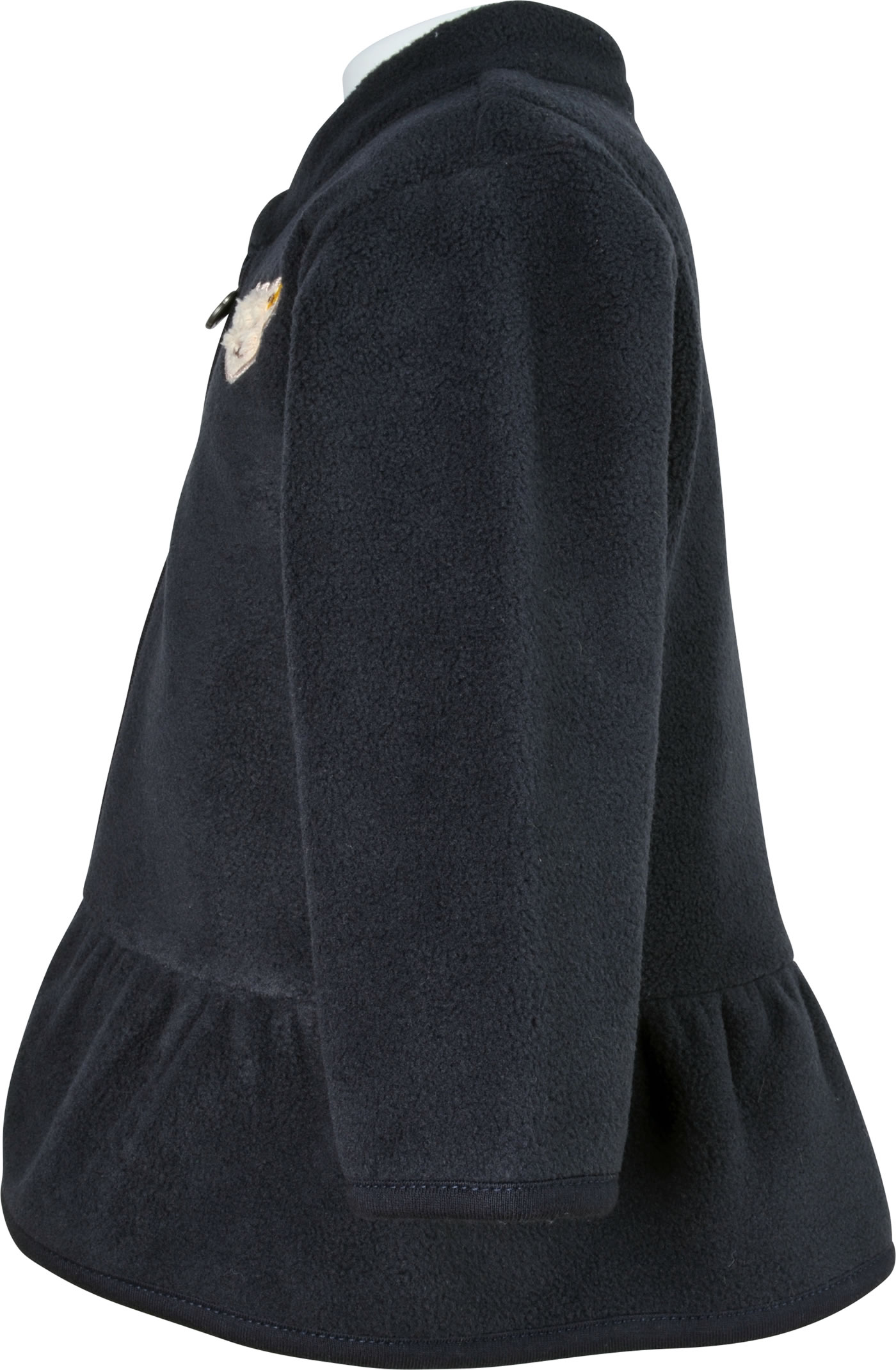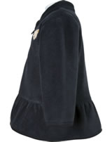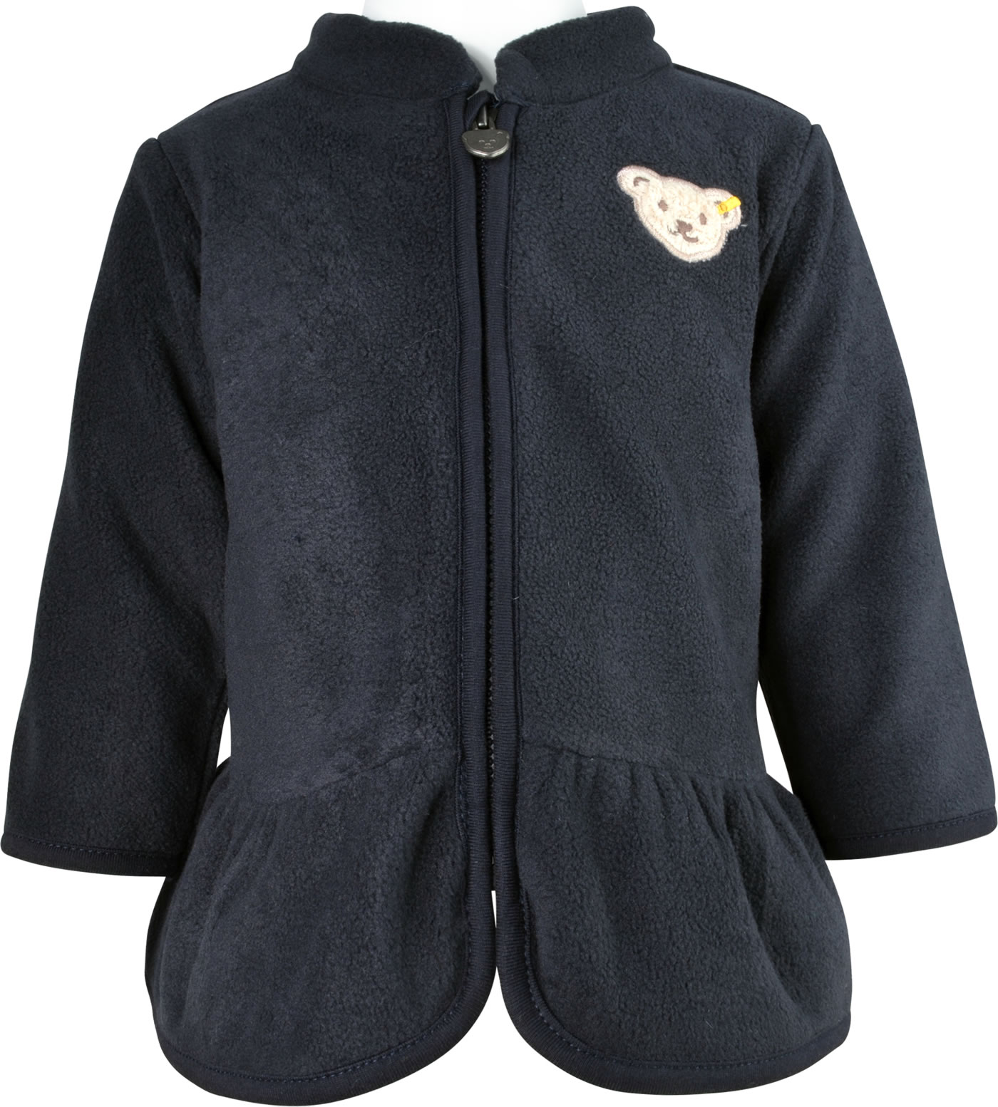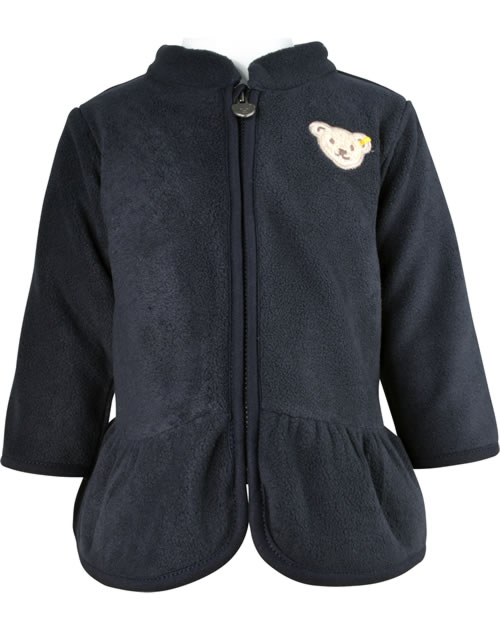 Warme, weiche Fleecejacke für Mädchen von STEIFF aus der Year of the Teddy bear-Kollektion. Die dunkelblaue Jacke hat einen Stehkragen und wird mit einem Reißverschluss geschlossen. Schöne Details sind der kleine STEIFF Bär auf der Brust und der Volant.