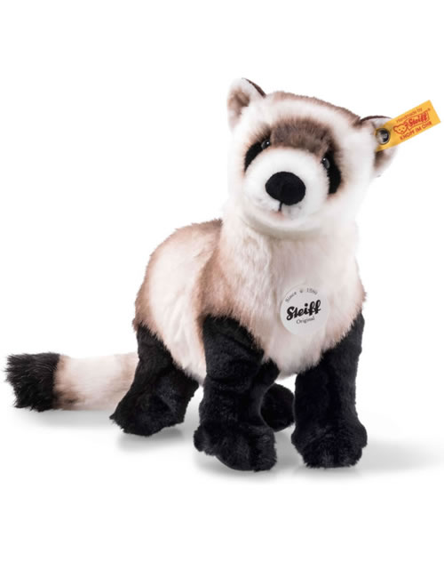 Ein putziges Kerlchen ist Protect Me Feri Frettchen. Das aus der Familie der Marder stammende Frettchen gehört zu einer vom Aussterben bedrohten Tierart. Sein Lebensraum in den Wäldern Europas wird von Jahr zu Jahr kleiner. Das liebenswerte, 25 cm große Frettchen zeigt seine ganze Schönheit mit den Bemalungen und Schattierungen, die in aufwändiger Airbrush-Technik gestaltet wurden. Seine schwarzen Beine bilden einen hübschen Kontrast zum weißen Körper. Freundlich blickt das weiße, mit braunen und schwarzen Schattierungen versehene Gesicht von Feri Frettchen. Feri möchte, dass Kinder und Erwachsene sich umschauen und sehen, wie großartig und schützenswert die Natur und damit auch sein Lebensraum sind. Aber natürlich will das niedliche, aus kuschelweichem Plüsch gefertigte Frettchen auch schmusen und schmiegt sich gerne in die Kinderarme. Das zauberhafte Protect Me Feri Frettchen ist ein Freund, der sich auf leisen Sohlen in jedes Herz schleicht.