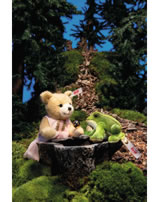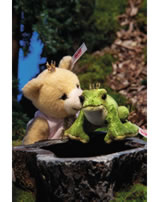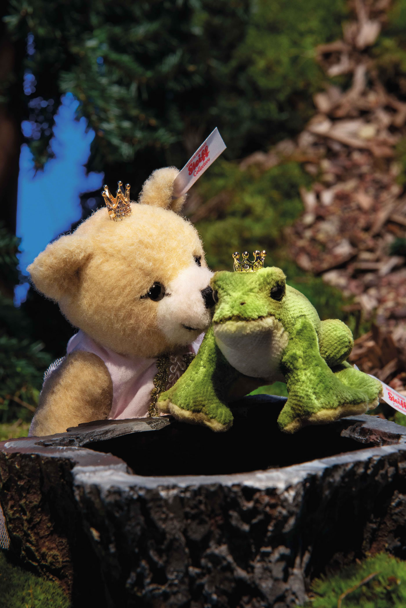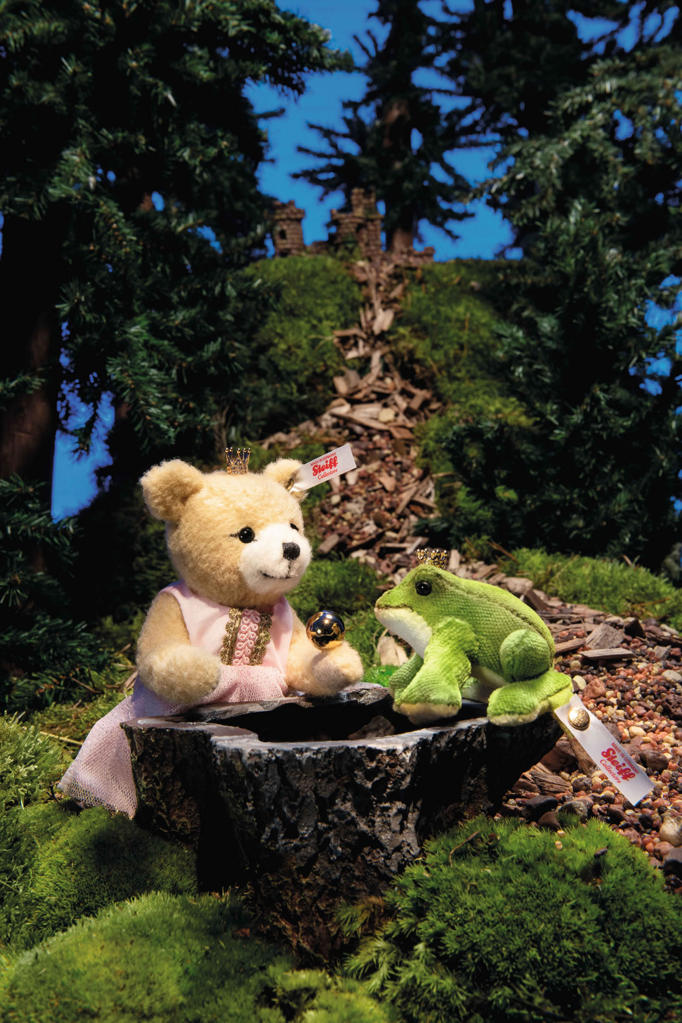 Wie im berühmten Märchen der Gebrüder Grimm blickt die sanft geschminkte, 5-fach gegliederte Teddybär-Prinzessin aus Wollplüsch mit Glitzer-Tüllrock verträumt in ihre goldfarbene Spielkugel. Ihr Retter – gekleidet in naturgetreu bedrucktem grün-weißen Nylex – erwartet die versprochene Belohnung. Als verzauberter Prinz trägt er bereits eine Krone mit Strasssteinen. Fairness ist in diesem Märchen oberstes Gebot. Ob ihr Kuss ihn verwandelt?
