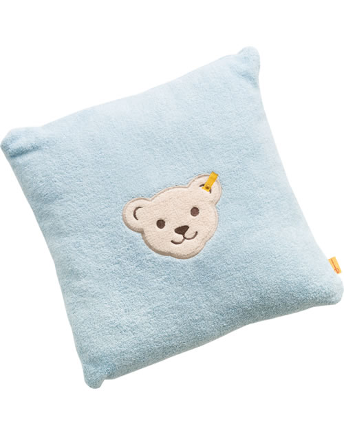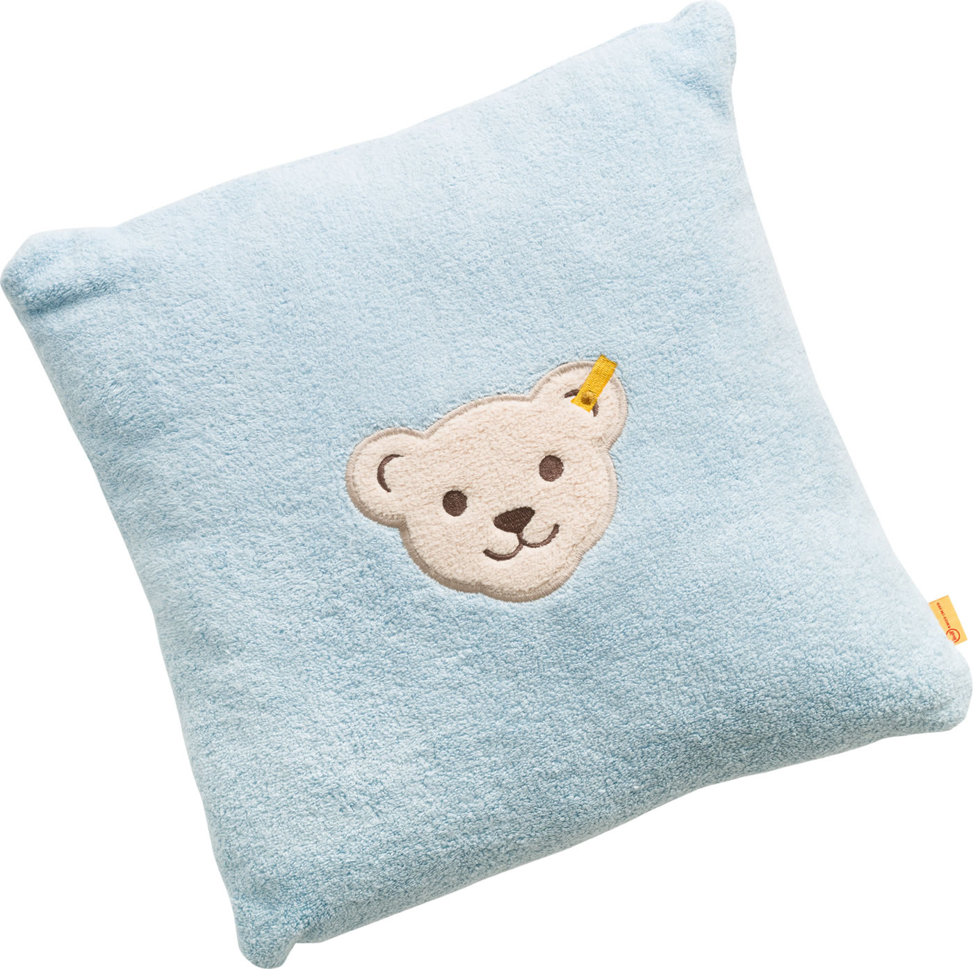 Frottee-Kissen mit kuschelweicher STEIFF Teddybären-Applikation auf der Vorderseite. Ein Reißverschluss ermöglicht das Herausnehmen des Inletts. Kissenbezug und Inlett sind waschbar.