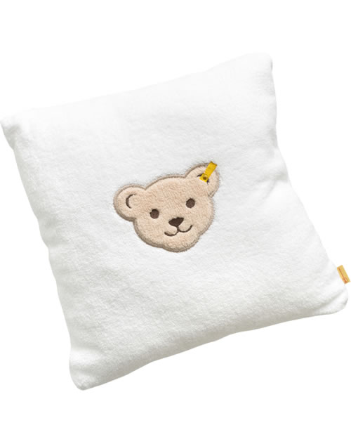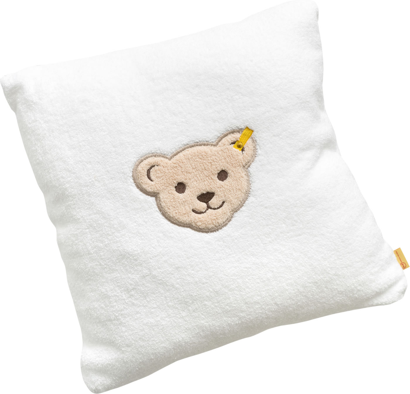 Frottee-Kissen mit kuschelweicher STEIFF Teddybären-Applikation auf der Vorderseite. Ein Reißverschluss ermöglicht das Herausnehmen des Inletts. Kissenbezug und Inlett sind waschbar.